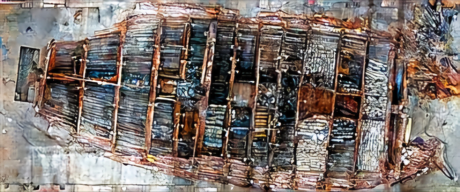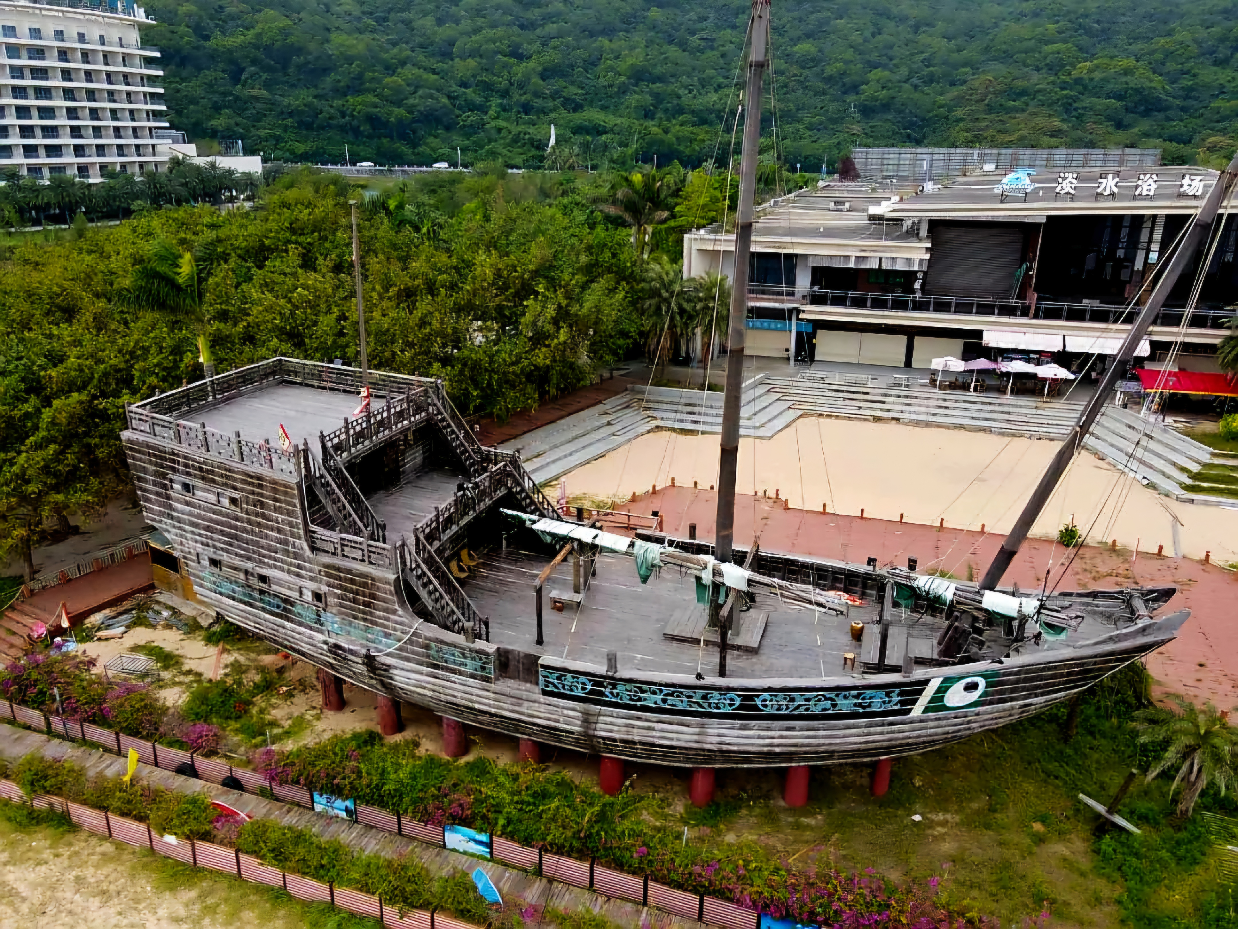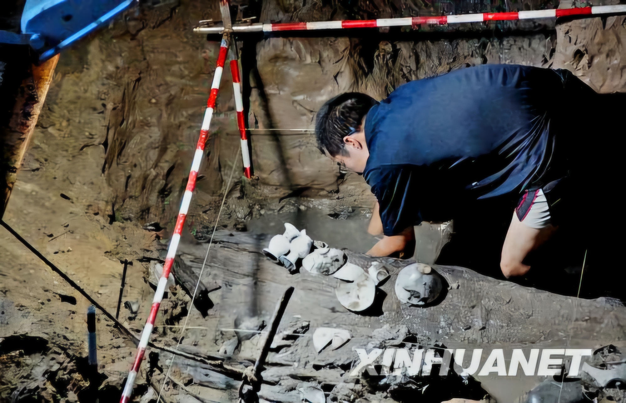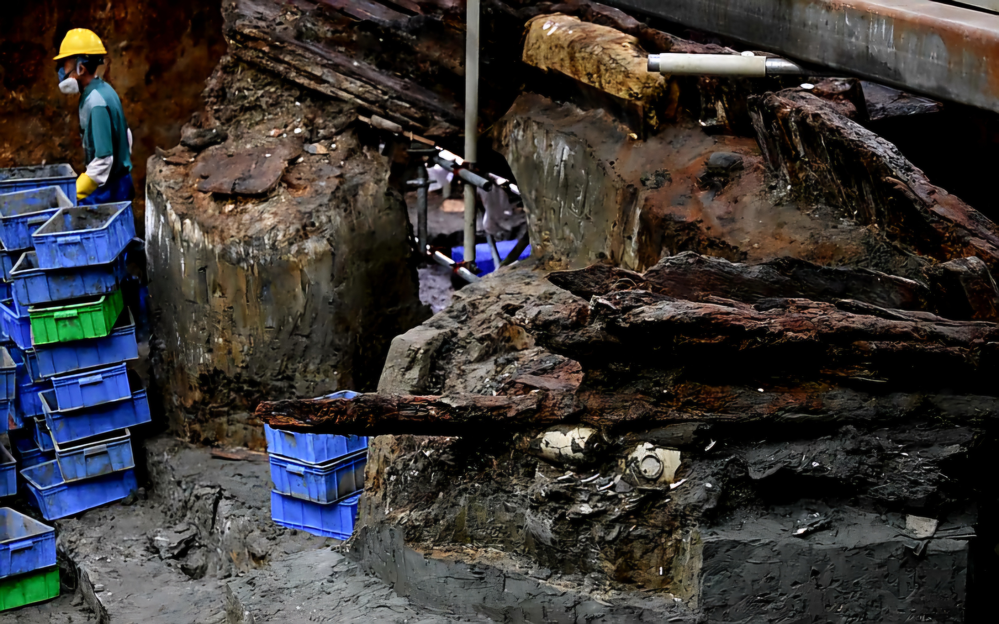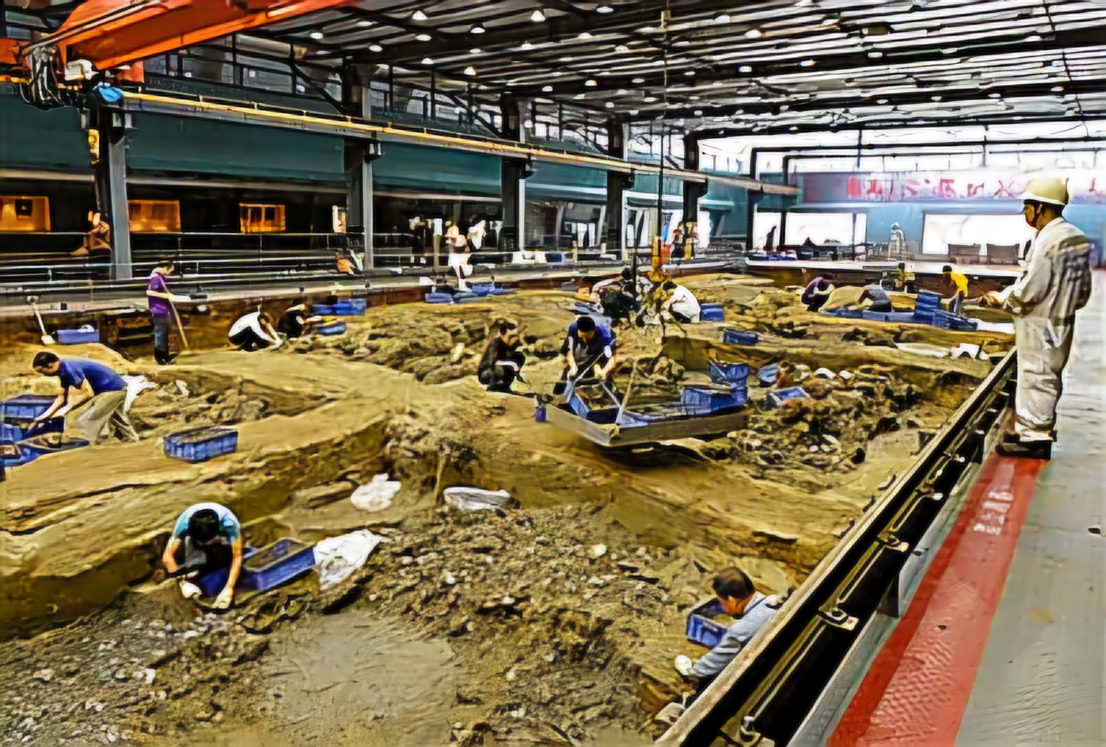 배 중앙 지점 양쪽은 깨끗이 빈 상태이고, 뱃머리는 대향 남쪽이며, 물고기 비늘이 여러 개 겹친 고대 중국 선박 독특한 구조를 보여준다.