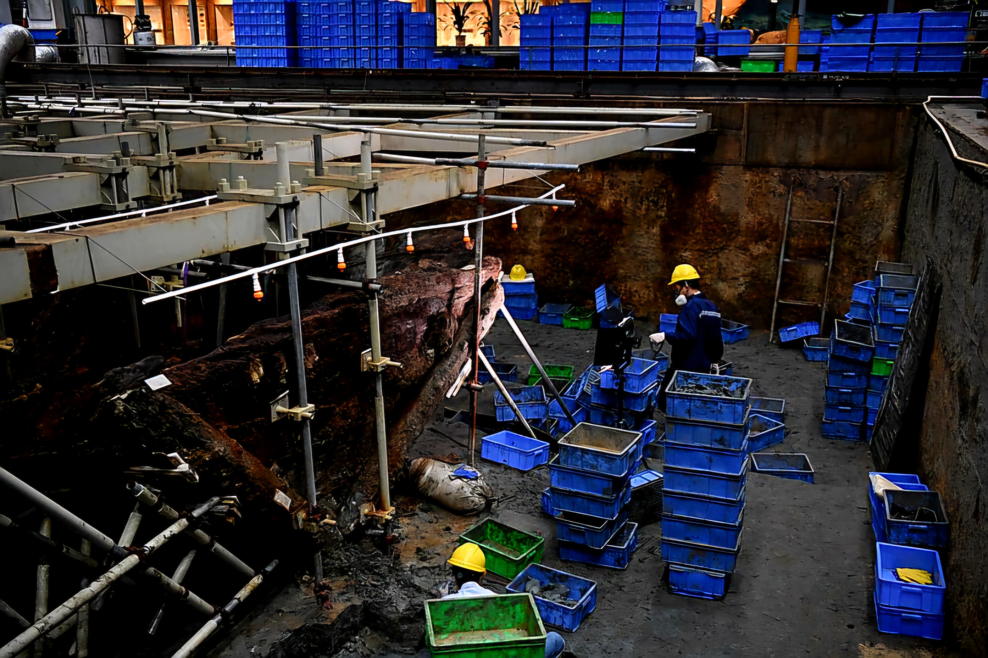 방문객들은 수영장 양쪽에 마련한 창문을 통해 진행 중인 선박 발굴 과정을 관람한다.