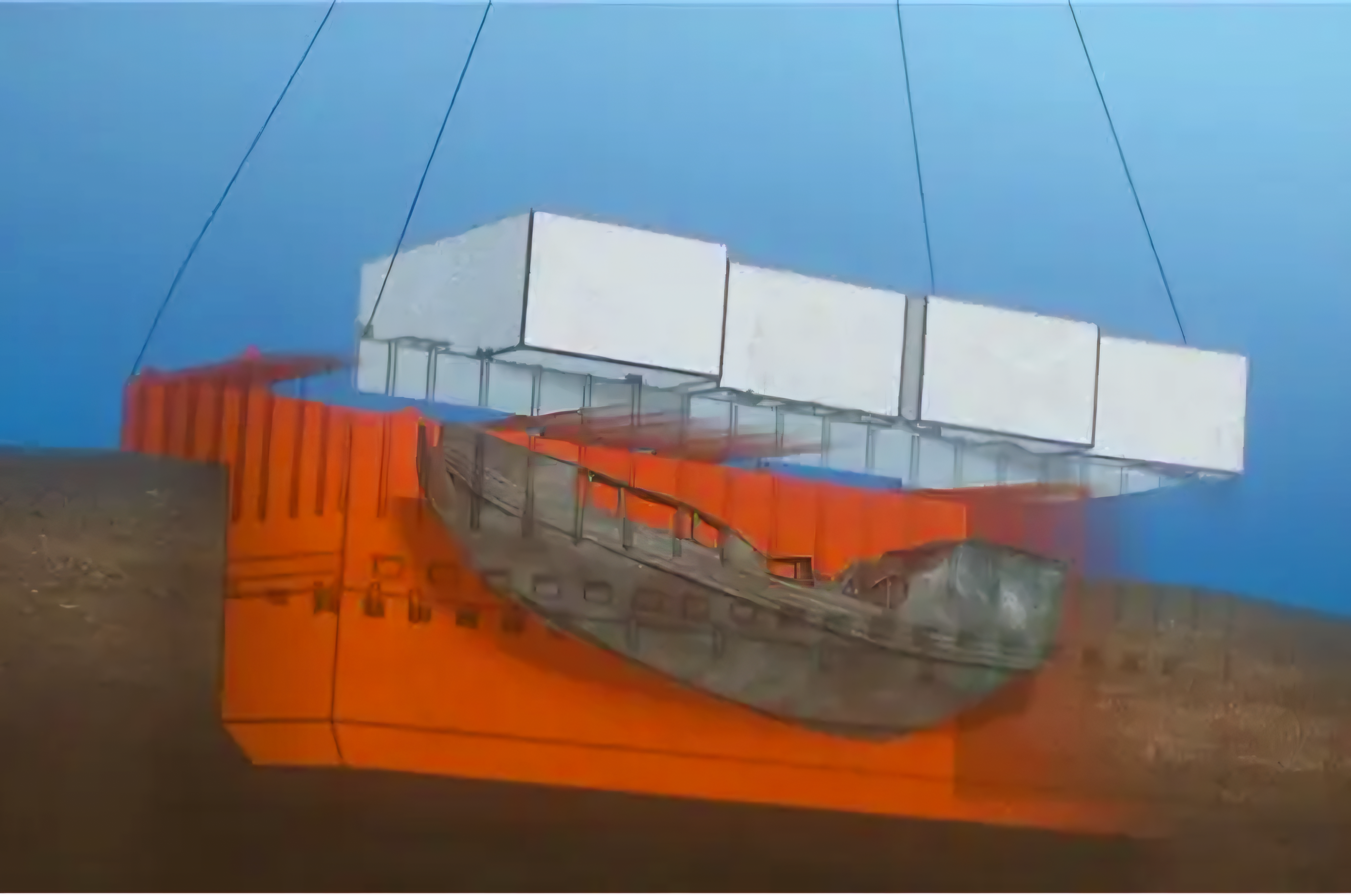선체 파손 방지를 위해 해저 진흙에 묻힌 상태 그대로 컨테이너에 담아 해저 진흙과 선체를 일괄 끌어올리는 방법을 채택했다.