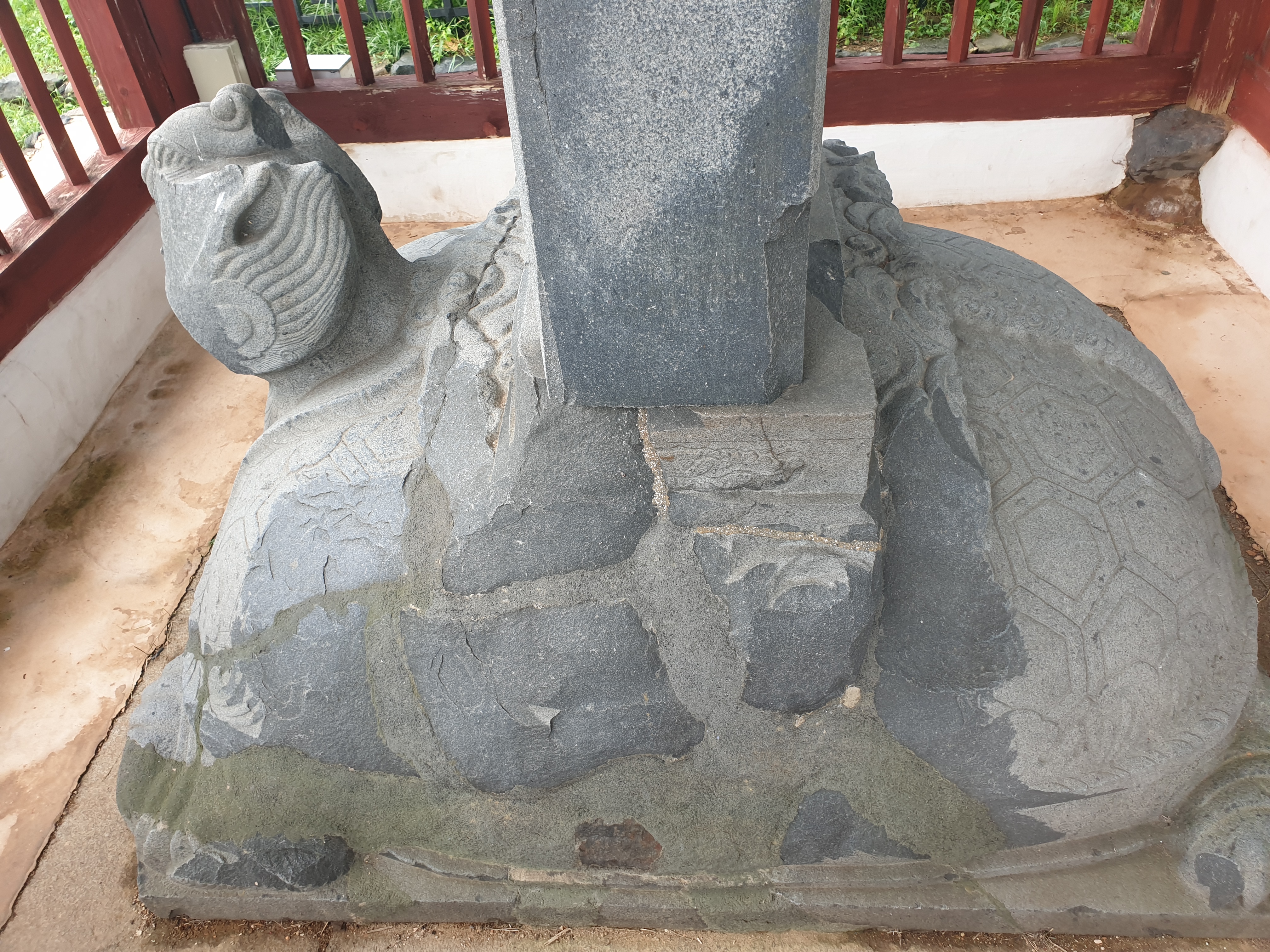 얼굴 일부분이 깨진 거북은 머리 위쪽에 둥근 뿔이 나 있고, 뒤로 째진 눈에는 눈썹이 휘말렸으며, 입은 무엇인가를 내뿜으려는 기세다. 등에는 선명한 이중 육각무늬를 새기고, 중앙에는 제법 굵직한 구름무늬를 사실적으로 표현했다.