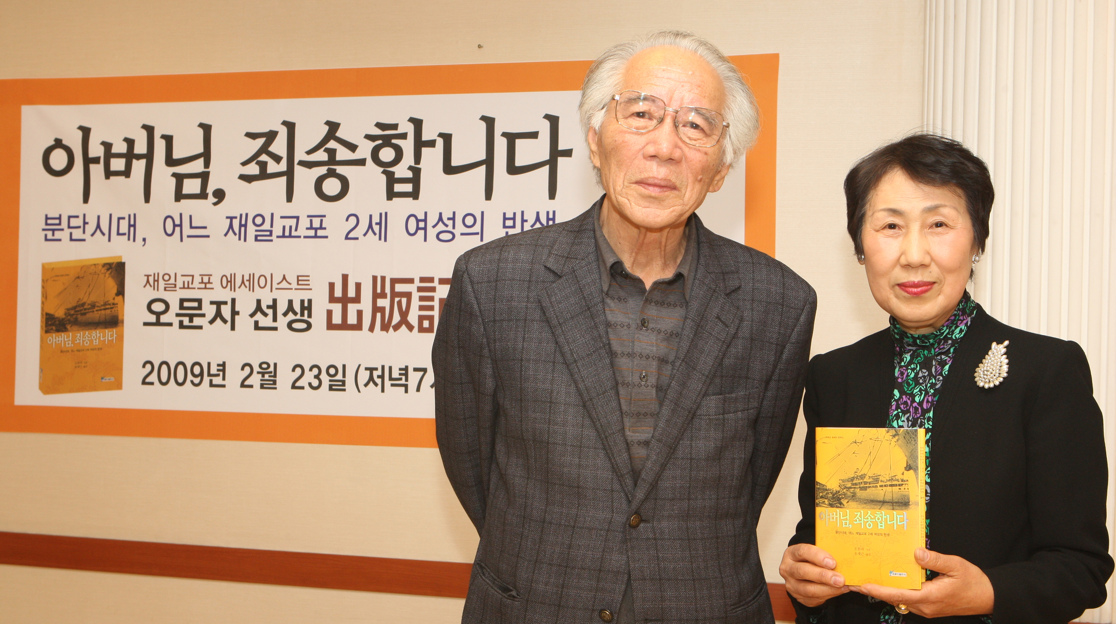 부인 오문자 씨 앞 자리에는 '아버님, 죄송합니다'라는 표제가 찍힌 한국어판 자전 에세이집이 놓였다. 이번 한국어판 출간에 즈음해 출판사인 도서출판 주류성 최병식 대표가 서울 여의도 모 음식점에서 마련한 작은 출판기념회에 노부부가 일본에서 입국하자마자 참석한 것이다.