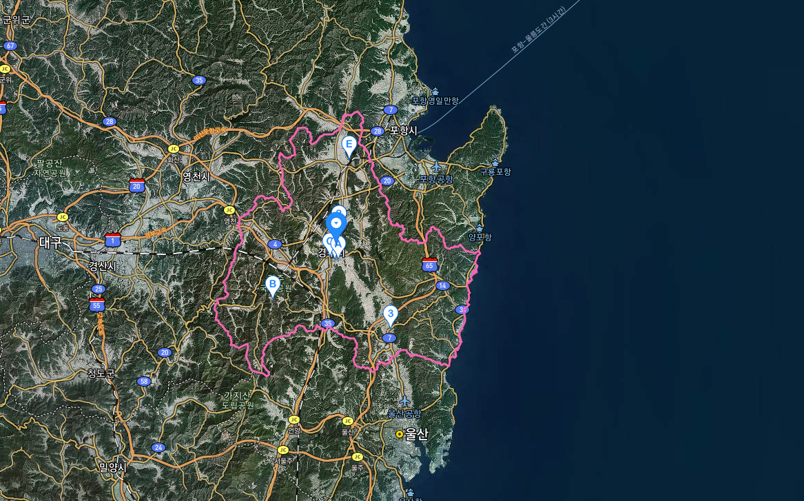다음지도로 꼬나본 경주시 행정구역이다. 그 아래 울산, 그리고 그 위쪽 혹은 동쪽 포항이나 마찬가지로 경주가 해변도시, 해양도시다. 다시 말해 경주는 해변을 낀 항구도시이기도 하다.