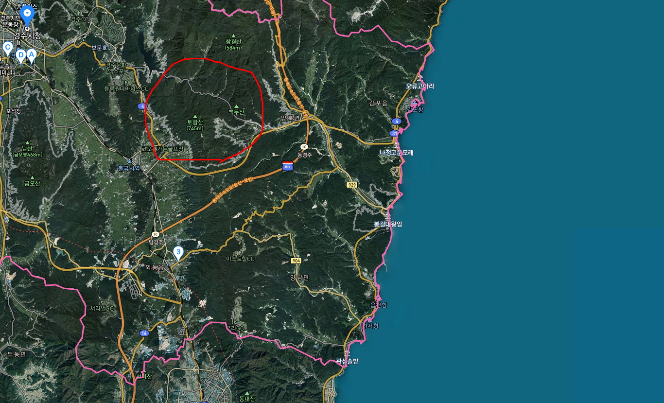 저 지도를 조금 더 깊이 들어가면 토함산이 있다. 경주시내 혹은 그 분지를 기준으로 할 적에 경주가 동쪽 동해로 향하는 데 결정적인 장애물이 되는 데가 바로 저 토함산이다. 저 토함산이 상징하는 태백산맥 남쪽 준령이 남북으로 길게 꼬리를 무는 바람에 우리가 경주라고 하면 그 토함산 서쪽 지구 일대를 지칭하는 줄로 안다.