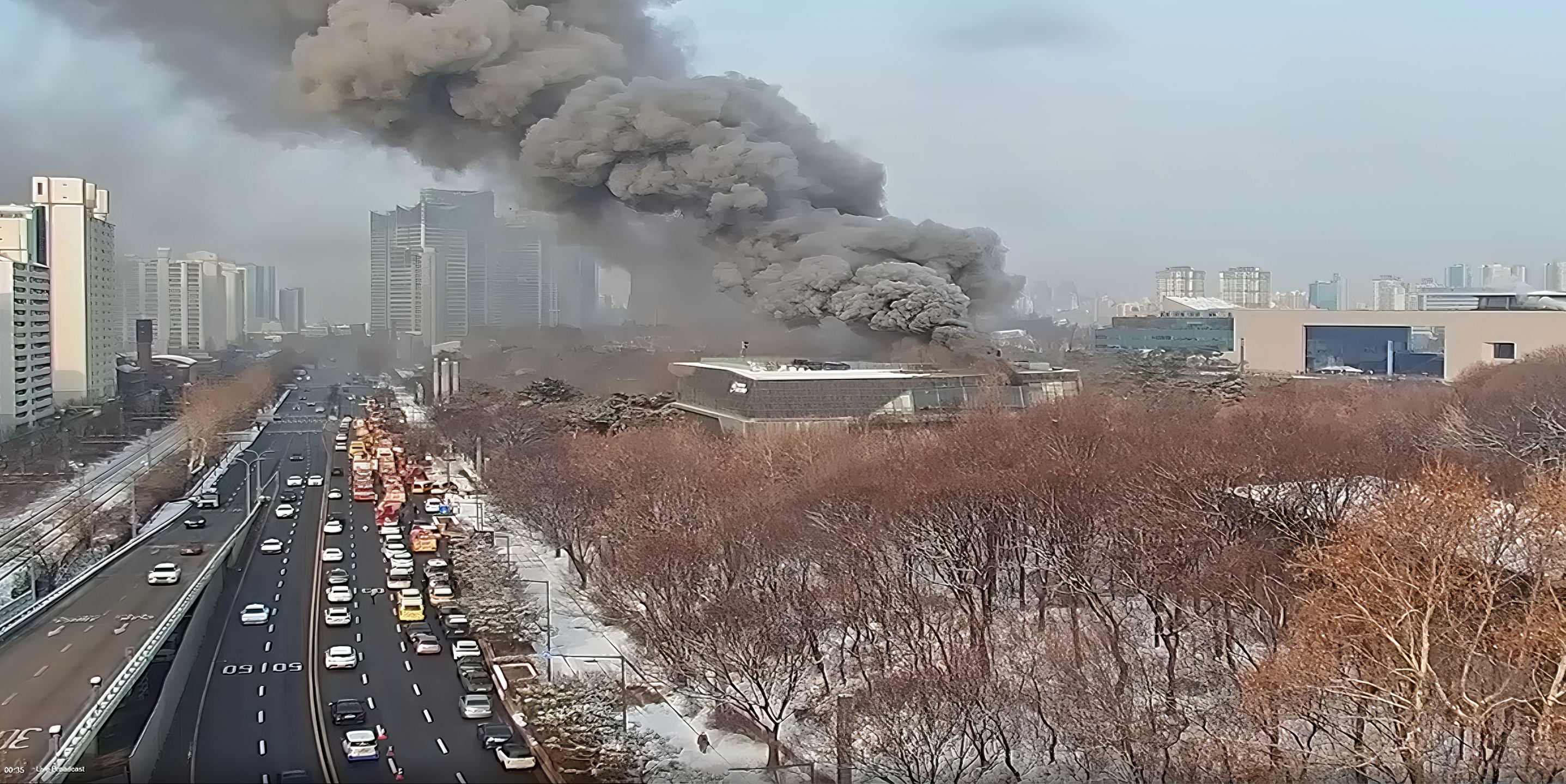 옥상으로 검은 연기가 모락모락도 아니요, 옛날 석탄을 때던 공장 굴뚝에서나 볼 법한 시커먼 연기가 거대한 규모로 치솟는 장면이 아닌가?