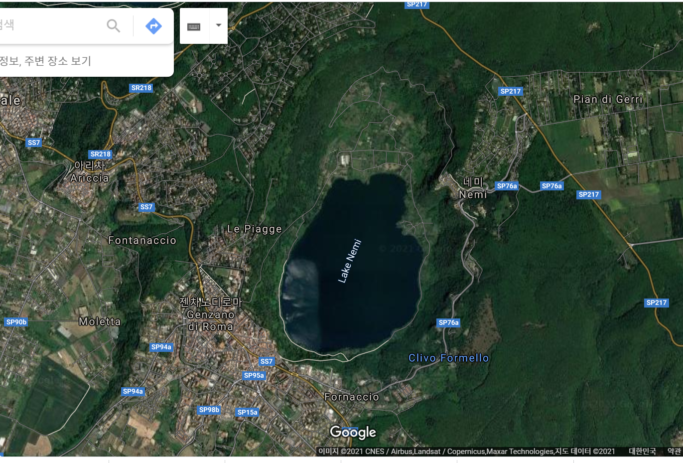 로마 남서쪽 교외 대륙에 호수 두 개가 나란히 섰으니 개중 Albano라는 데가 상대적으로 크고 다시 그 남서쪽 인접 지점에 작은 호수가 있어 이곳이 네미 호수 Lake Nemi 라는 데다.