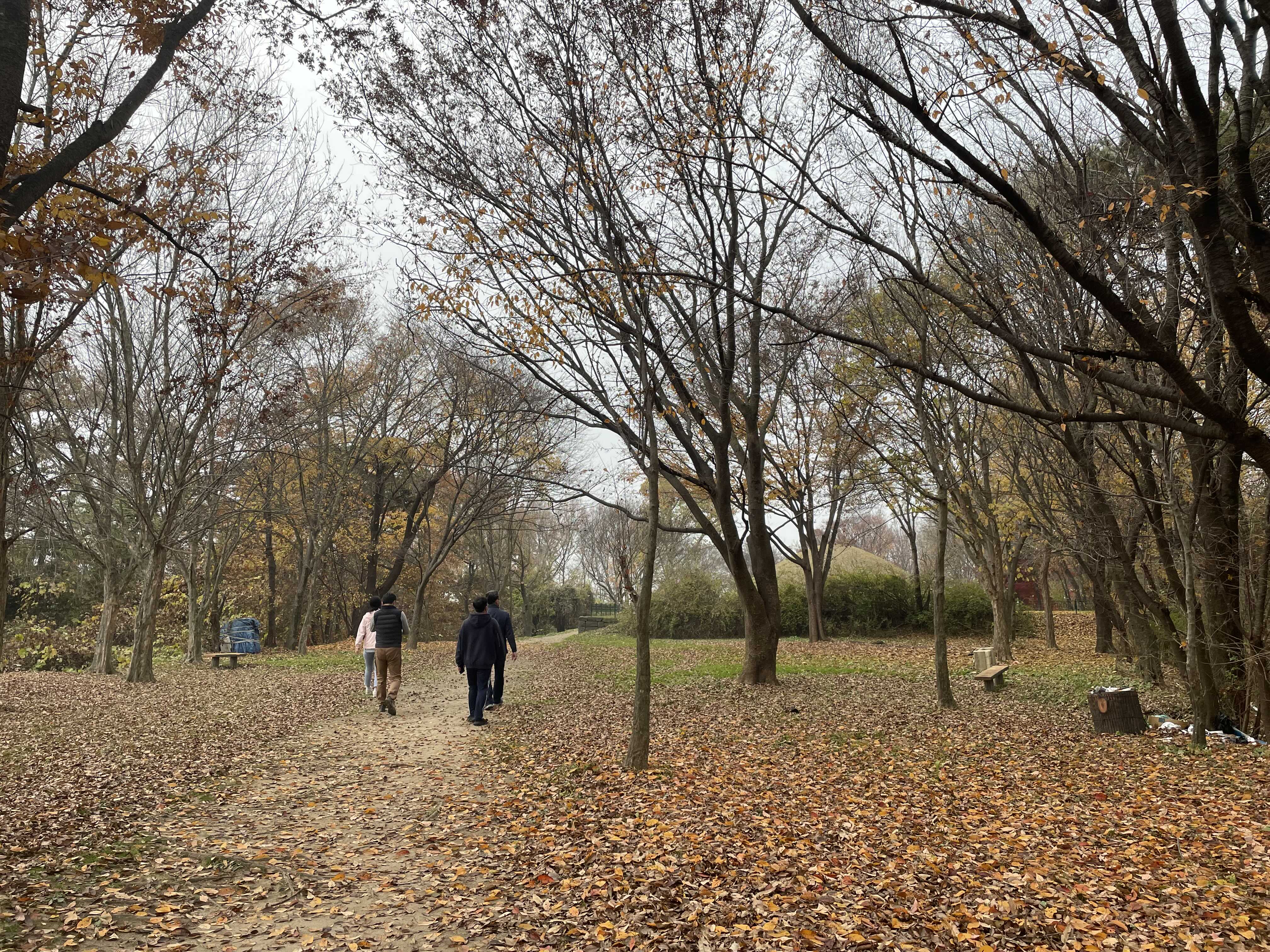 갈색 바스스 쌓인 낙엽과 뜬금없지만 뿌연 미세먼지가 늦가을 운치를 더해줍니다.
