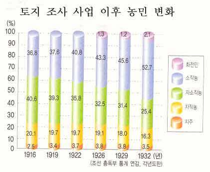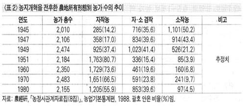 이 시기에 농지개혁이 이루어지면서 일제시대 말까지 80퍼센트를 육박한 소작농이 급격히 줄어들고, 비록 영세할망정 자작농 숫자가 급증하였다.