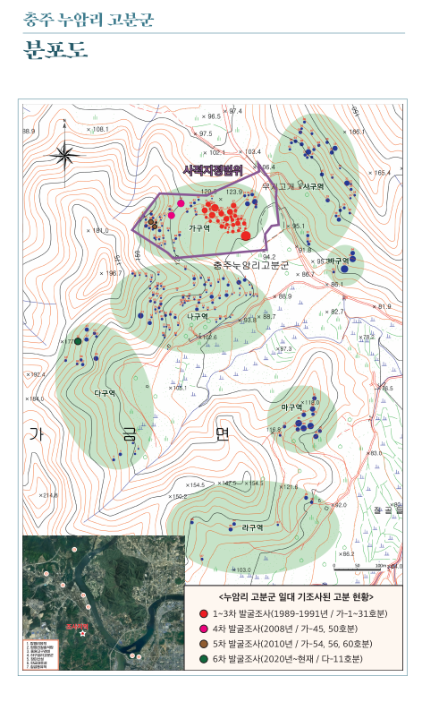 이 양상을 보면 충주 누암리 고분군은 그 분포양상과 사적 지정 구역이 따로 논다는 사실을 단박에 안다. 아마도 현실적인 이유가 컸으리라 짐작하거니와, 무덤이 분포하는 양상을 보면 그 밀집도가 가장 높은 코어 구역을 중심으로 사적이 지정됐음을 안다.