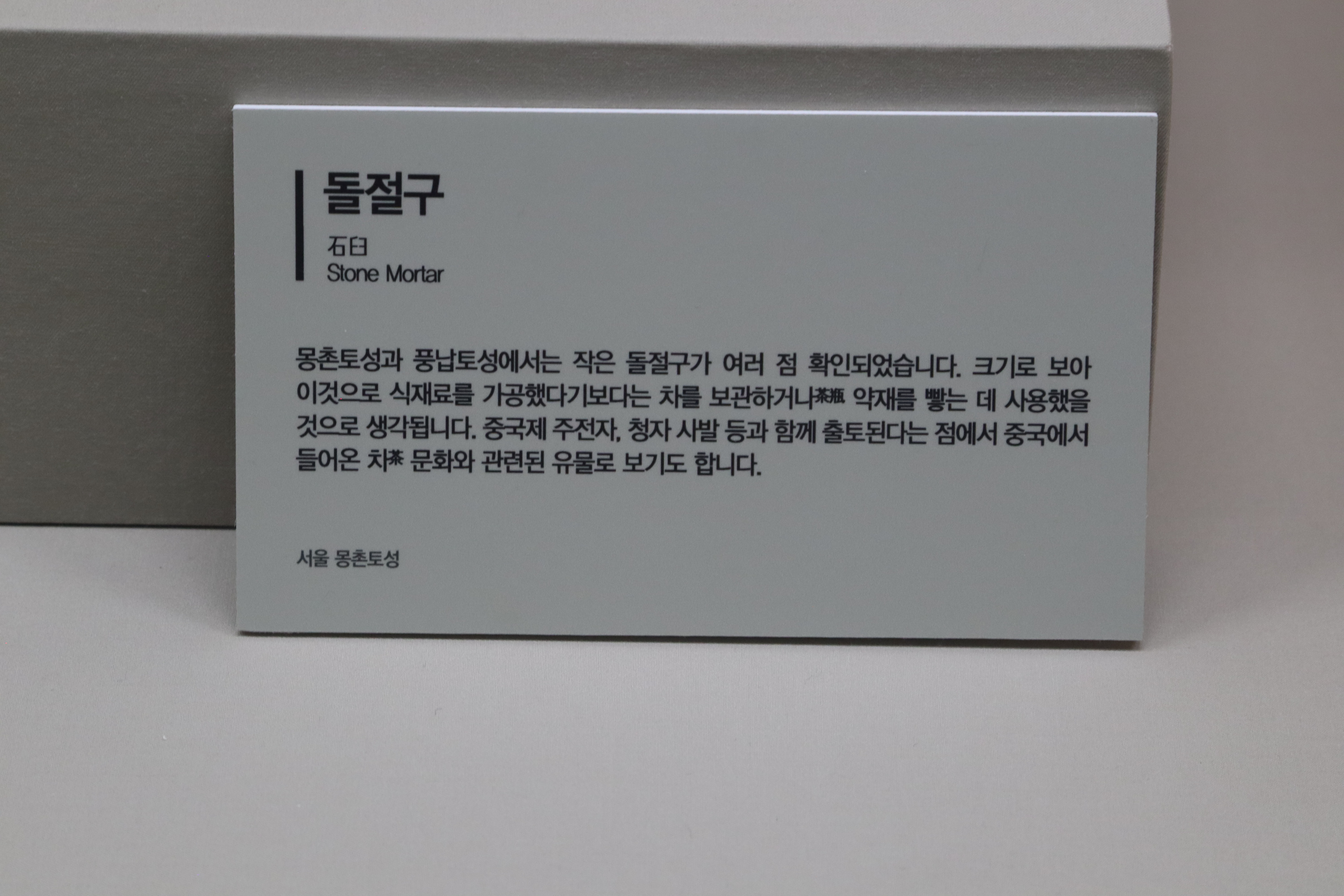 몽촌토성과 풍납토성에서는 작은 돌절구가 여러 점 확인되었습니다. 크기로 보아 이것으로 식재료를 가공했다기보다는 차를 보관하거나[茶甁] 약재를 빻는 데 사용했을 것으로 생각됩니다. 중국제 주전자, 청자 사발 등과 함께 출토된다는 점에서 중국에서 들어온 차 문화와 관련된 유물로 보기도 합니다.