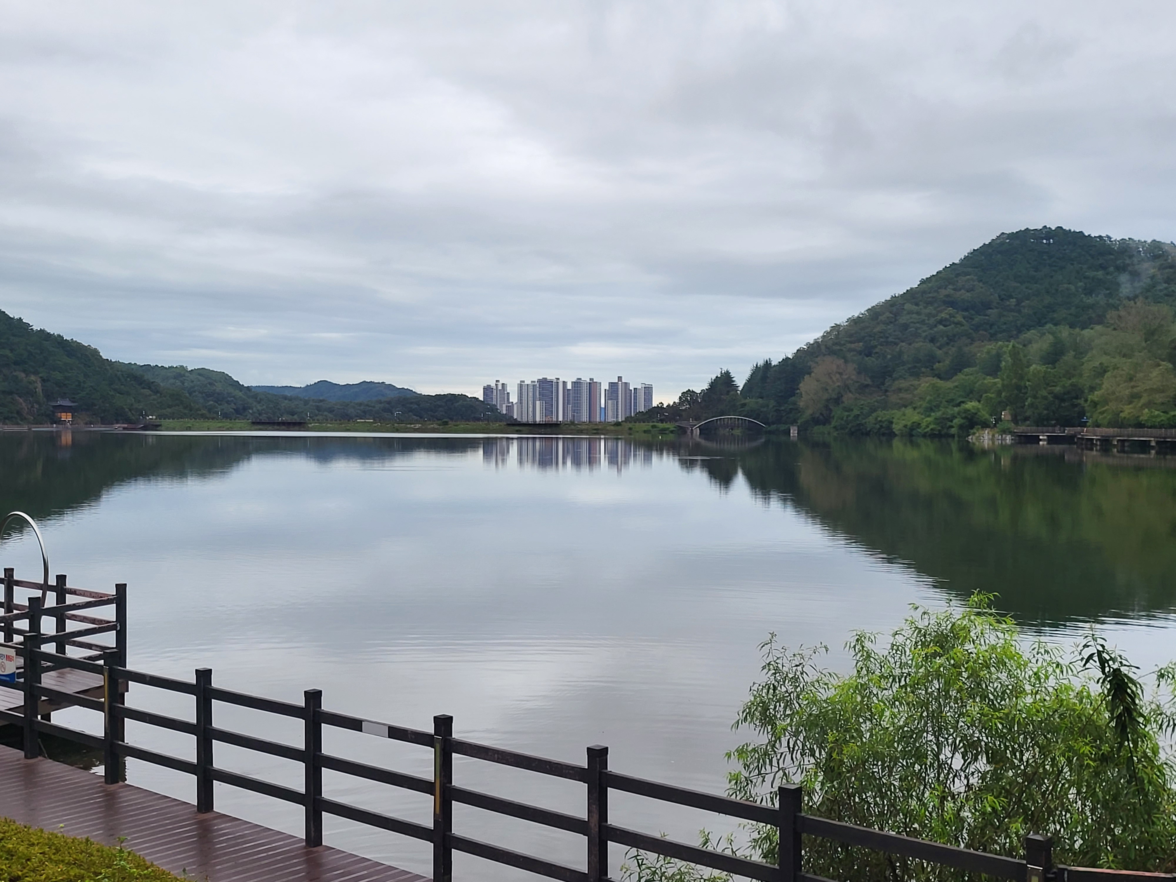 반쯤 구름 허리춤 둘러싼 금오산과 그를 감싼 금오산제는 눈부시게 아름다웠다.