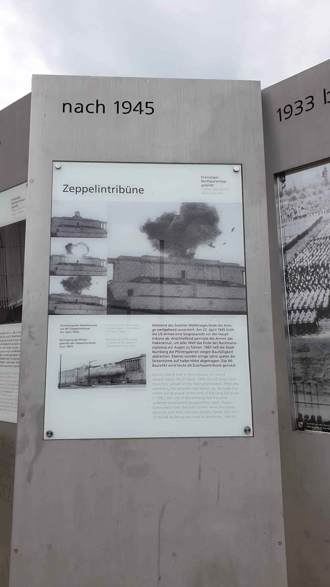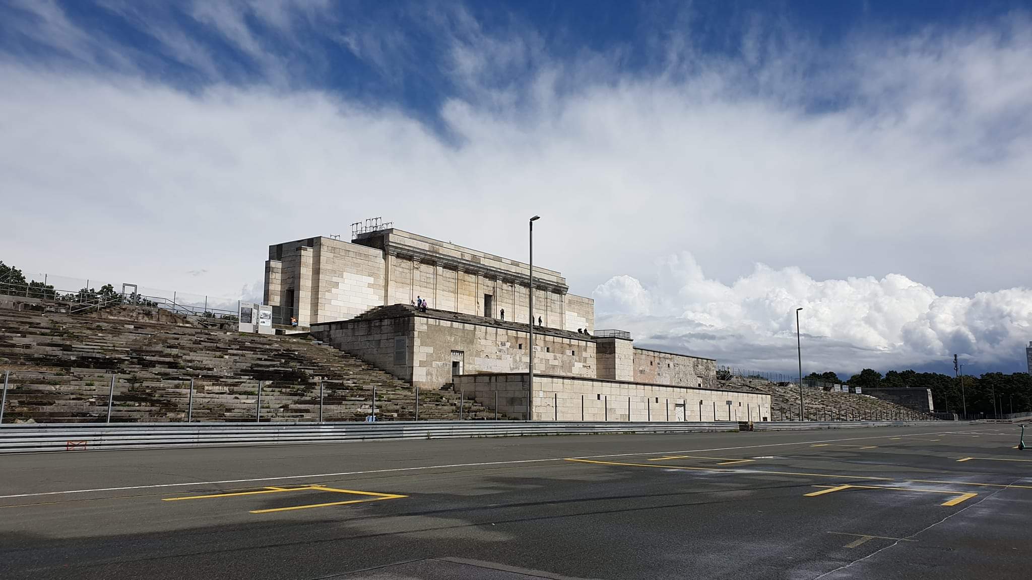ㅇ제페린필드 Zeppelinfeld. 나치가 완성한 유일한 현존 구조물. 전당대회장. 그리스 신전에서 영감. 나치가 폭발적 인기를 얻게된 일명 "조명 쇼-빛의 대성당"의 그 곳이다. 건물 꼭대기에 설치되었던 나치 로고는 전쟁 직후 폭파되었다. <들어가면 니 책임 Enter at your owm risk>라고 입구에 붙어 있음. 근데 전시패널도 있음(?). 정비 중임. 예상치 못하게 2시간이나 머무르게 만든 장소. 이 단상에 올라서, 당시 사진을 보며, 아래 공터를 내려다 보는 느낌은.