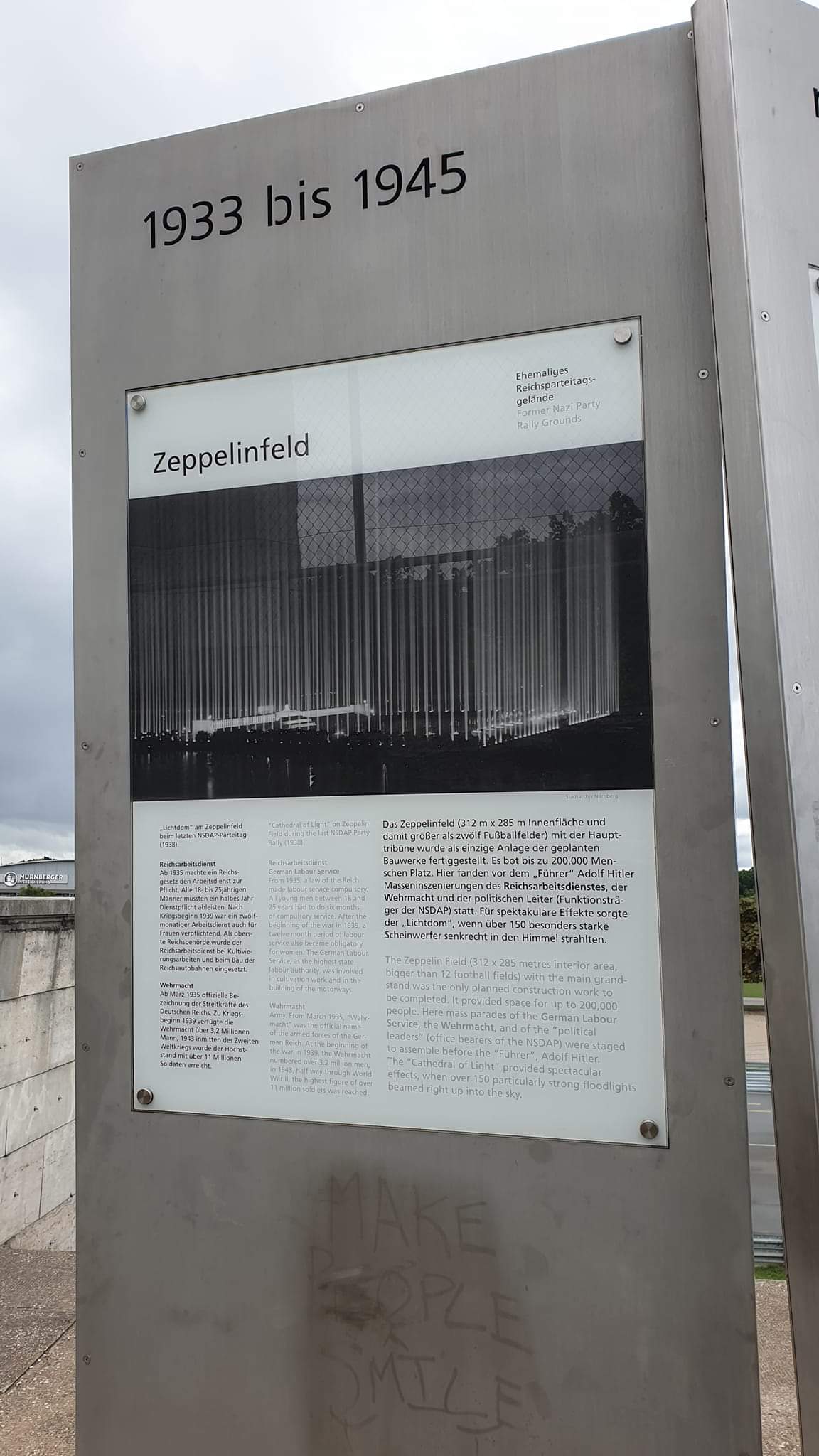 ㅇ제페린필드 Zeppelinfeld. 나치가 완성한 유일한 현존 구조물. 전당대회장. 그리스 신전에서 영감. 나치가 폭발적 인기를 얻게된 일명 "조명 쇼-빛의 대성당"의 그 곳이다. 건물 꼭대기에 설치되었던 나치 로고는 전쟁 직후 폭파되었다. <들어가면 니 책임 Enter at your owm risk>라고 입구에 붙어 있음. 근데 전시패널도 있음(?). 정비 중임. 예상치 못하게 2시간이나 머무르게 만든 장소. 이 단상에 올라서, 당시 사진을 보며, 아래 공터를 내려다 보는 느낌은.