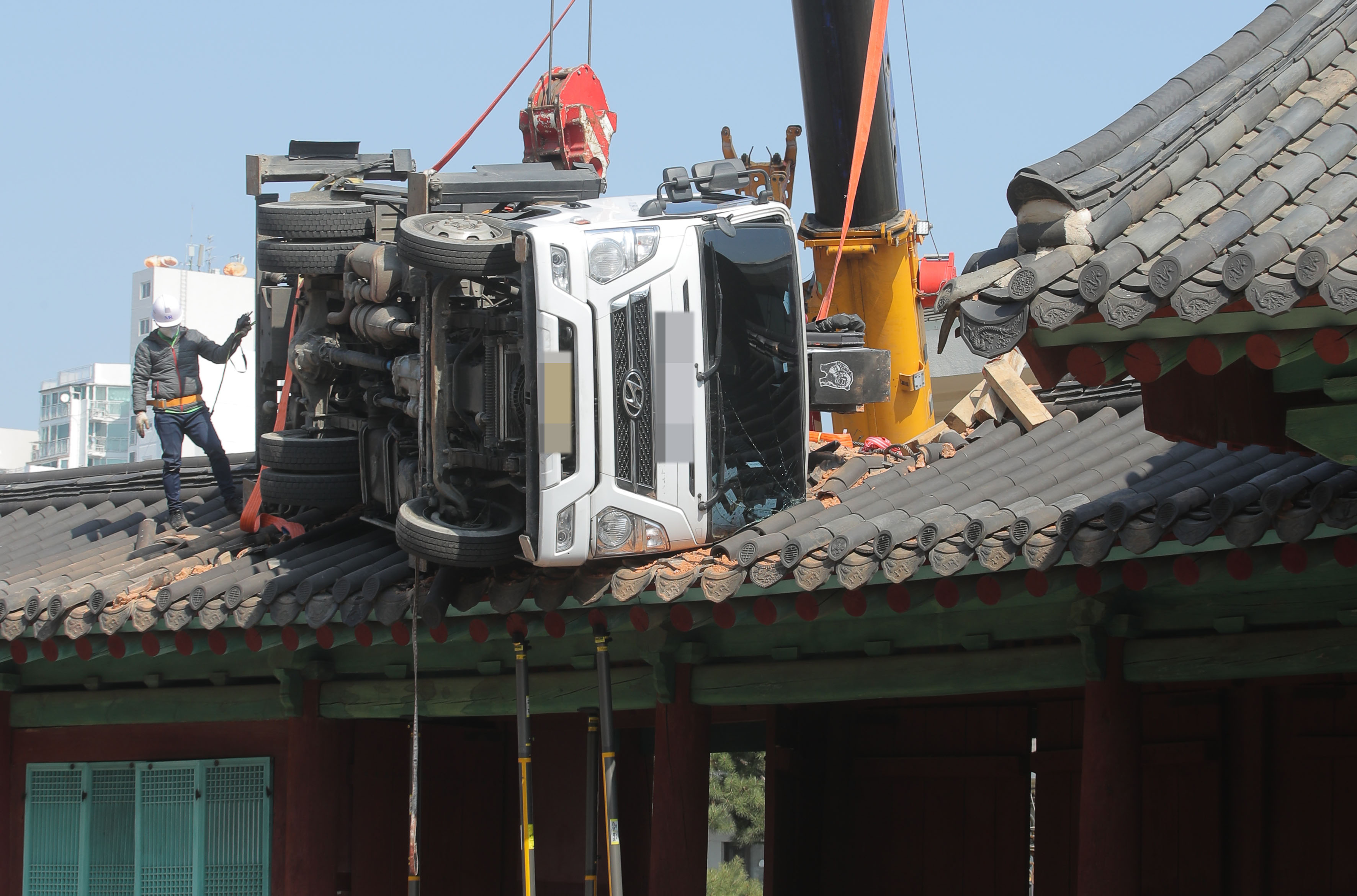 아주 박살을 냈다. 얼마나 들이받았으면 저 모양이 되었을까 싶다. 더구나 턱이 있는데, 저걸 뚫고서 들이받았나 보다. 저만하길 다행이다 싶다. 반파한 저 정문 왼편 너머로 보이는 건축물들이 진짜 문화재다.