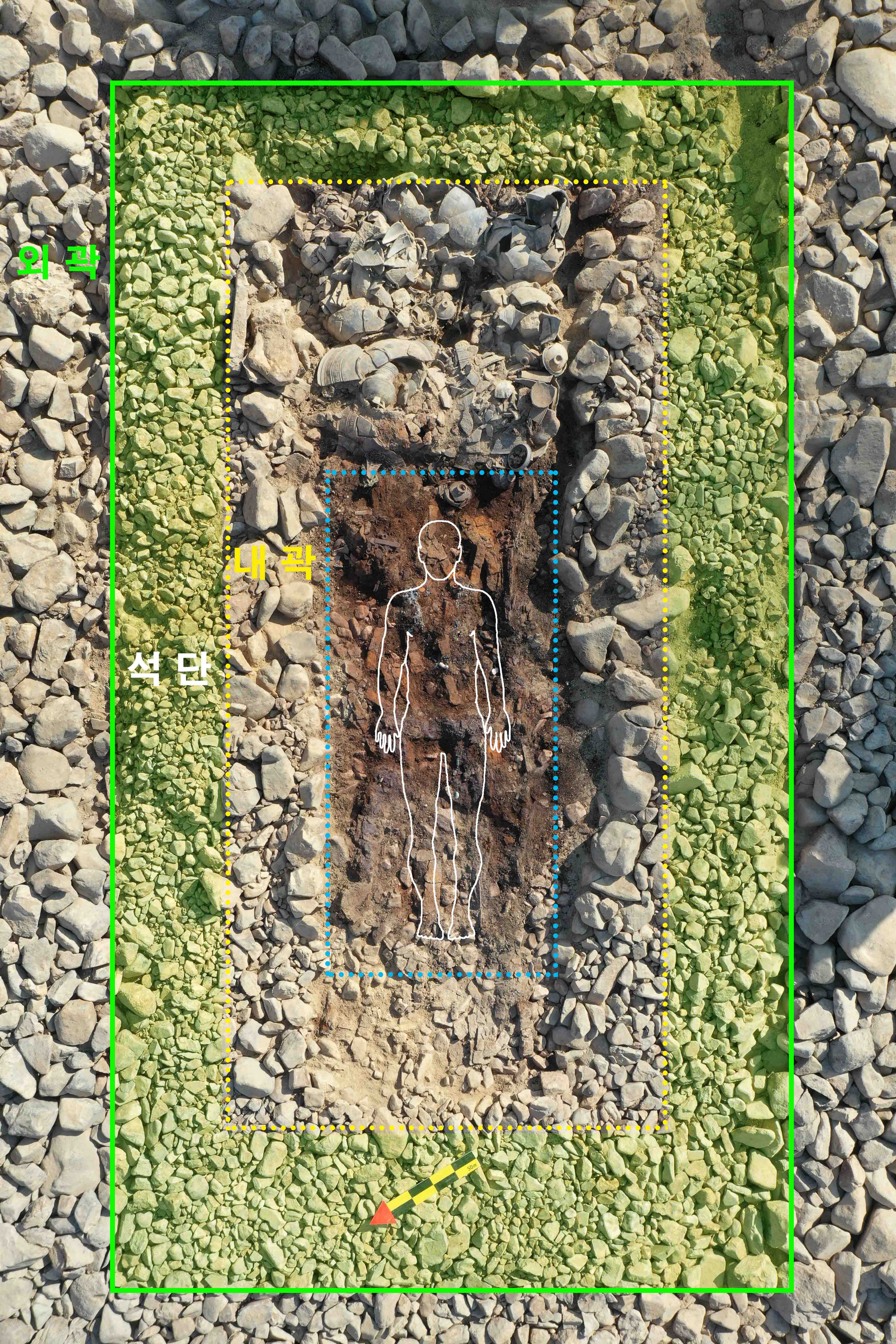 바로 요거다. 요런 위치에서 요런 유물들이 출토했으니 시체 위치를 저리 추정한 것이다. 인골도 나왔으니 말 다했지 뭔가?