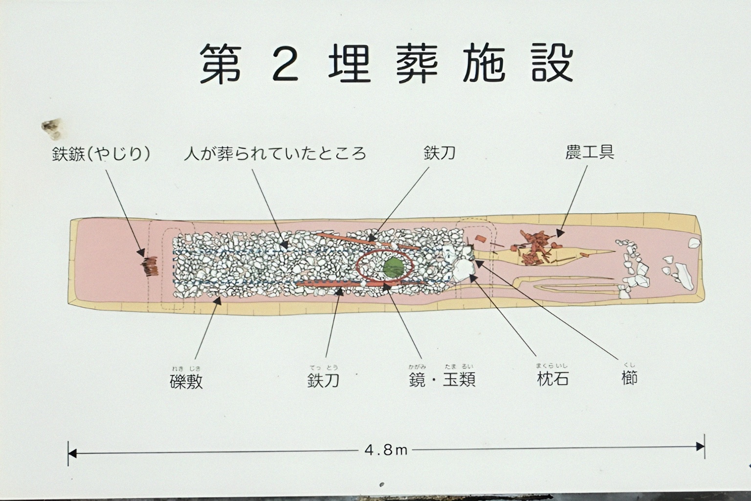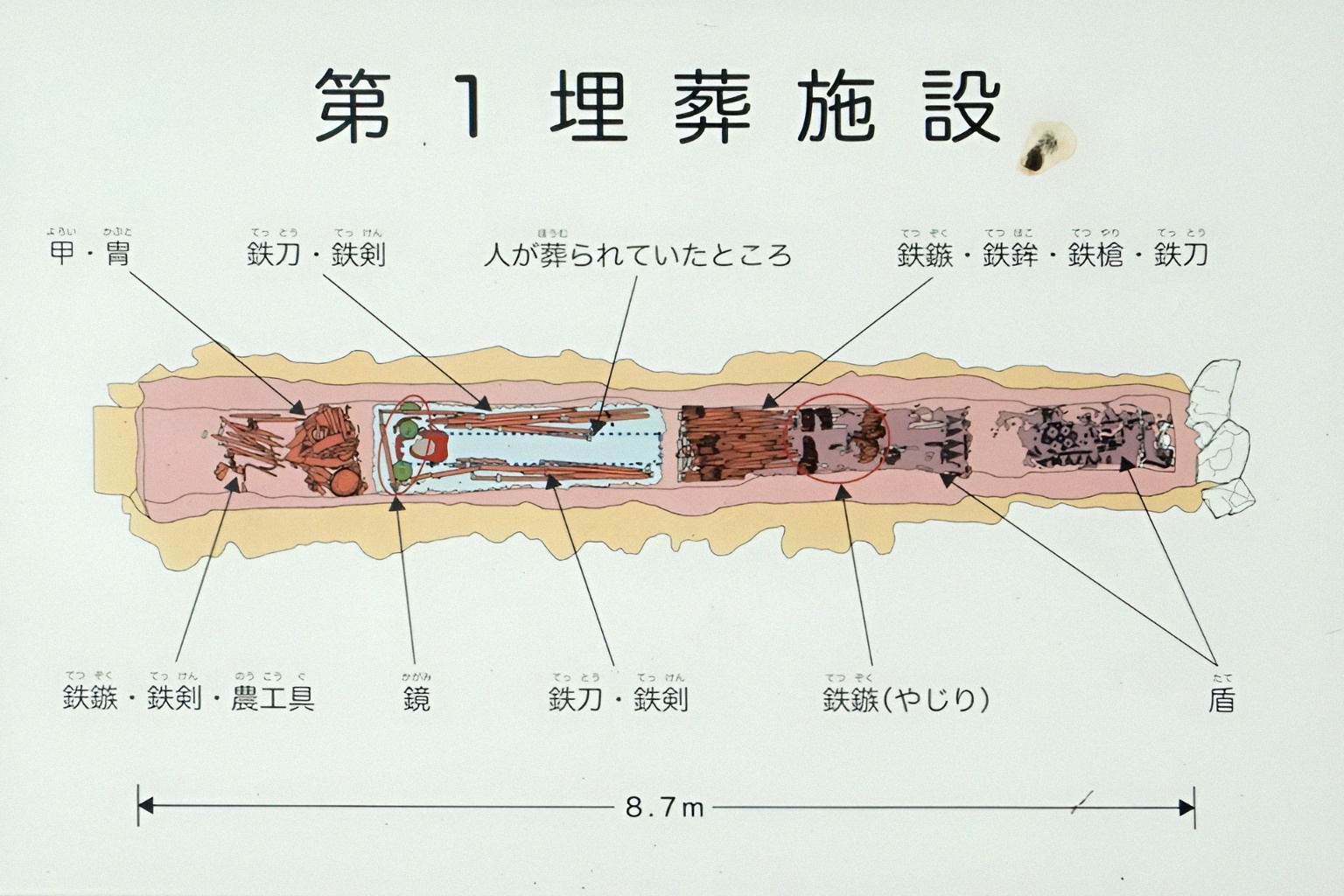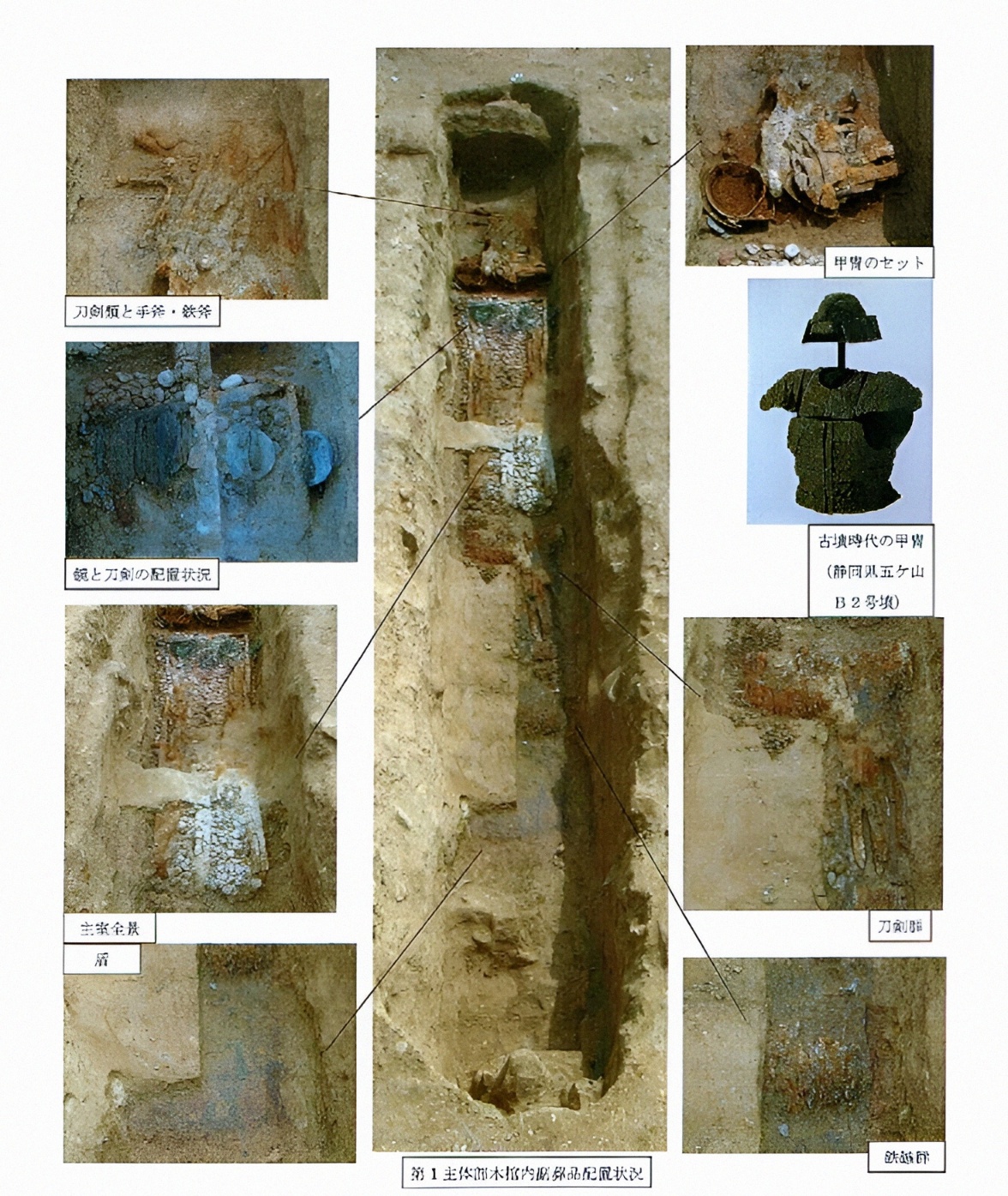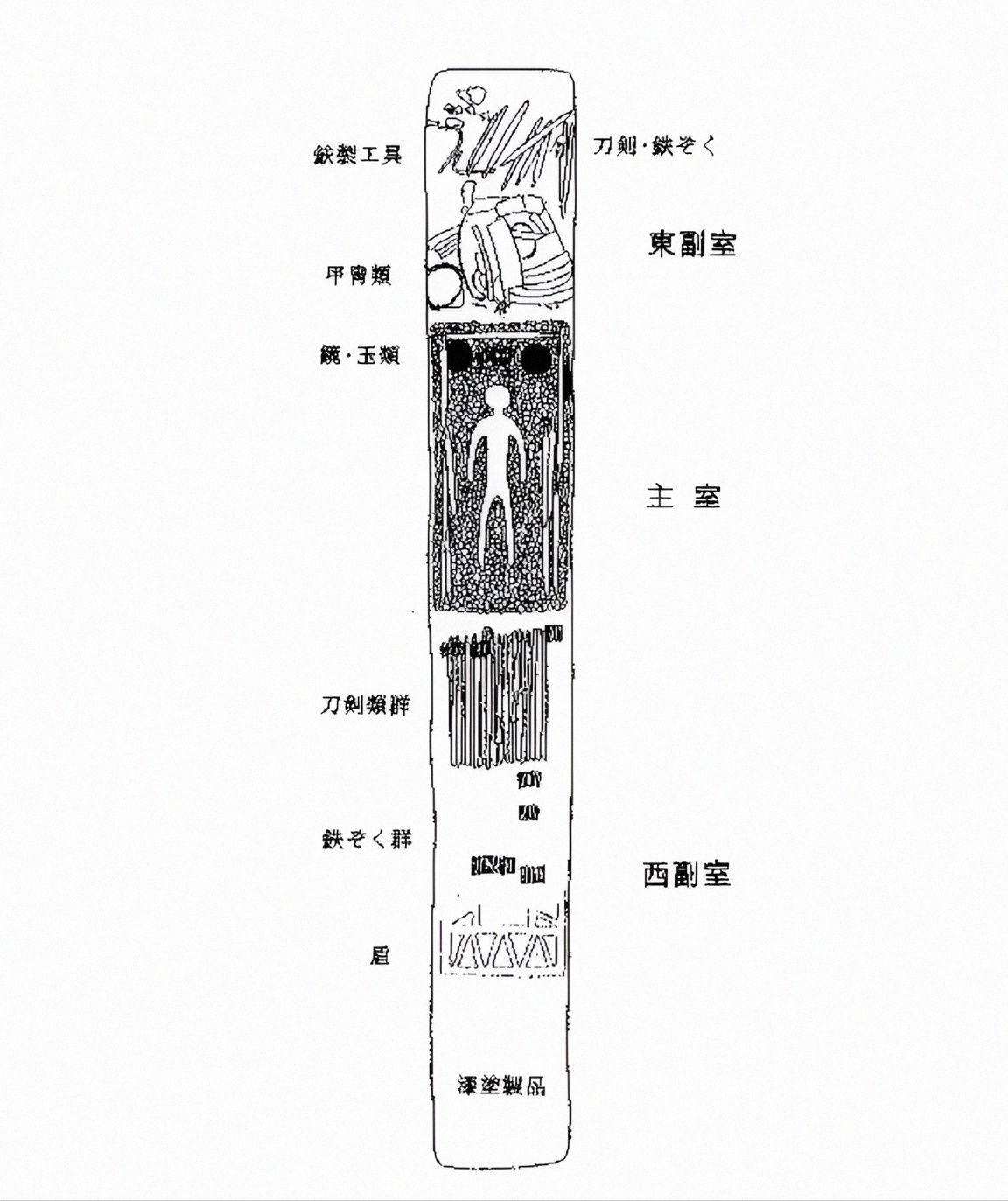 1실에서는 도검류刀剣類나 철촉鉄鏃이 비상하게 많이 출토하고 방패나 갑주甲冑類도 확인되는 점에서 묻힌 사람은 군인(장군이었겠지?)이었다고 생각된다.