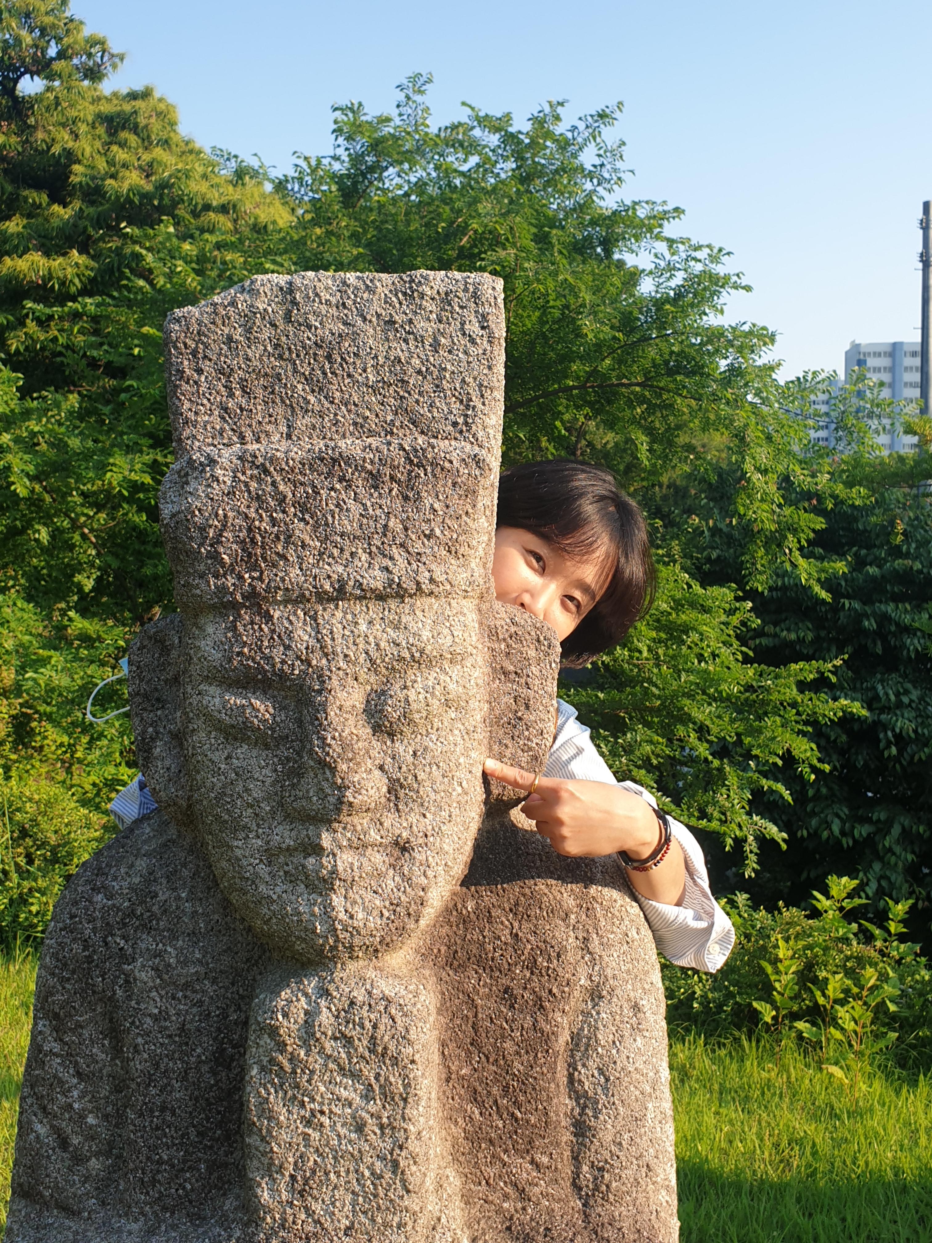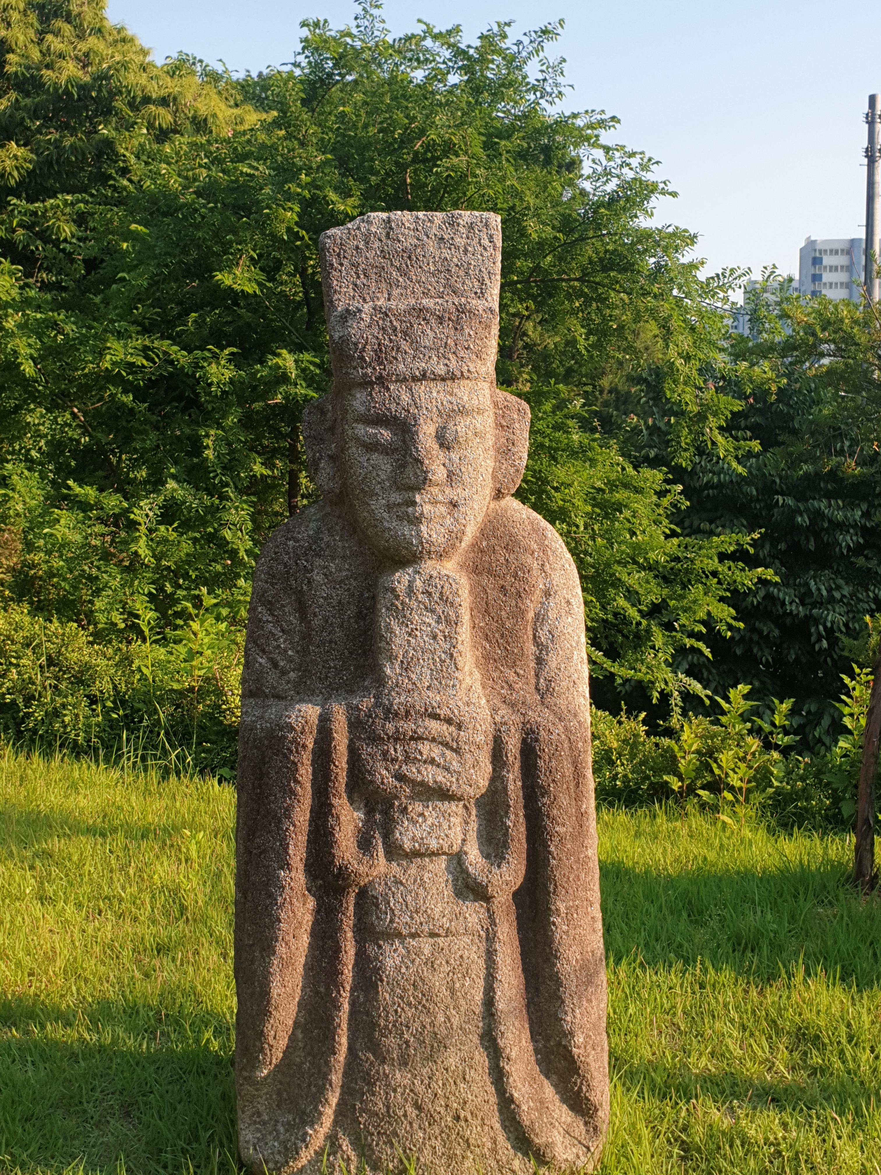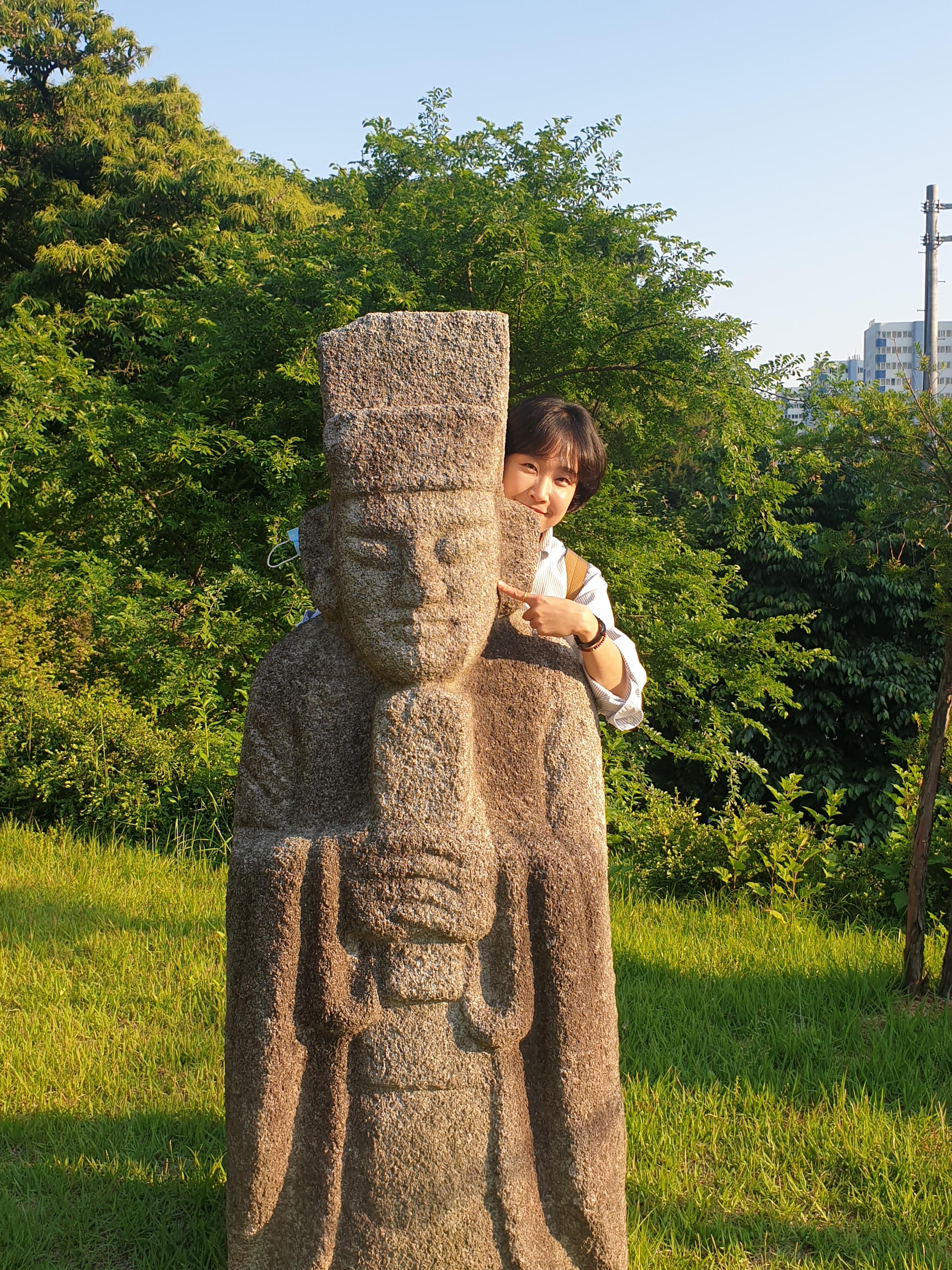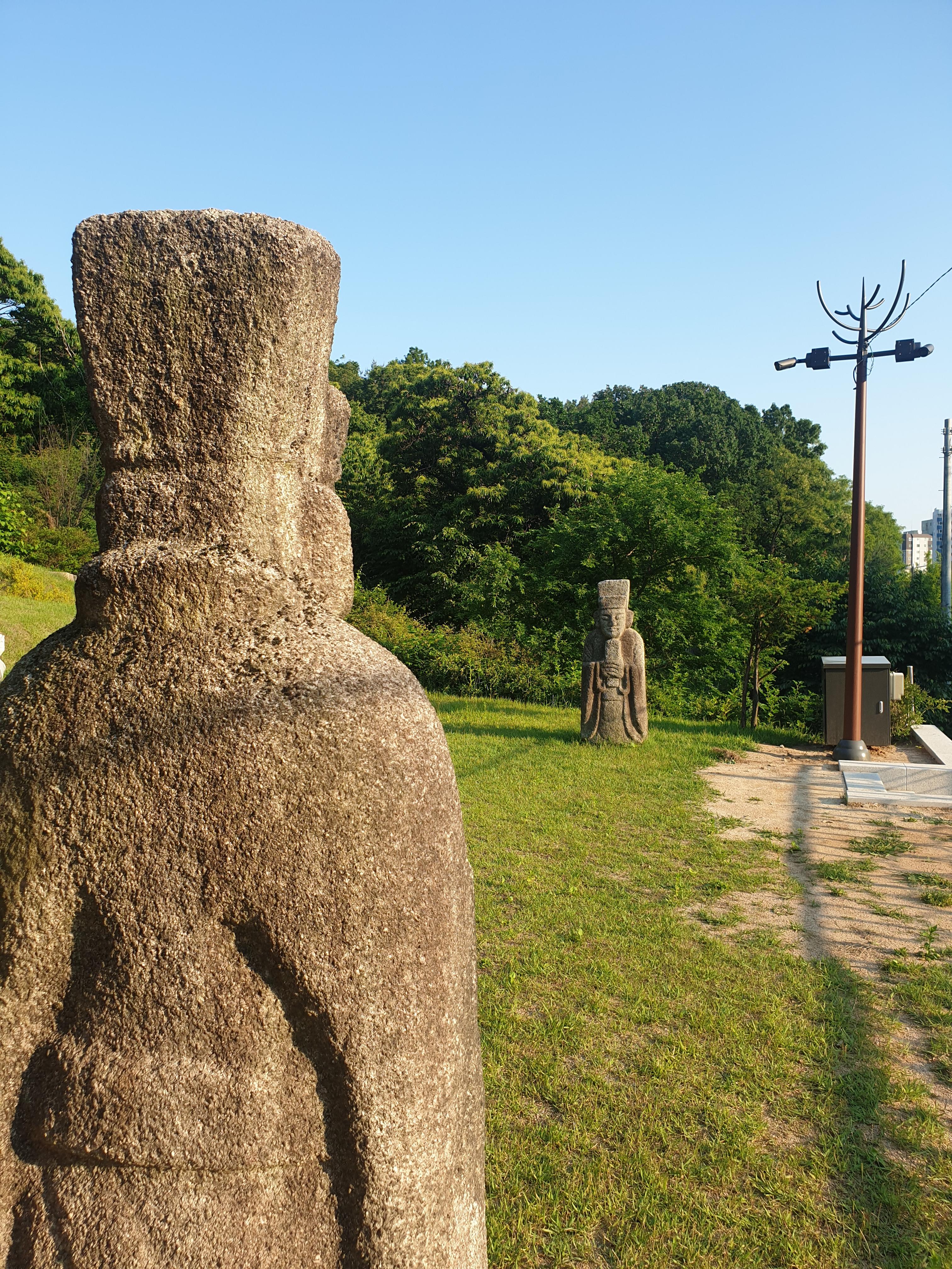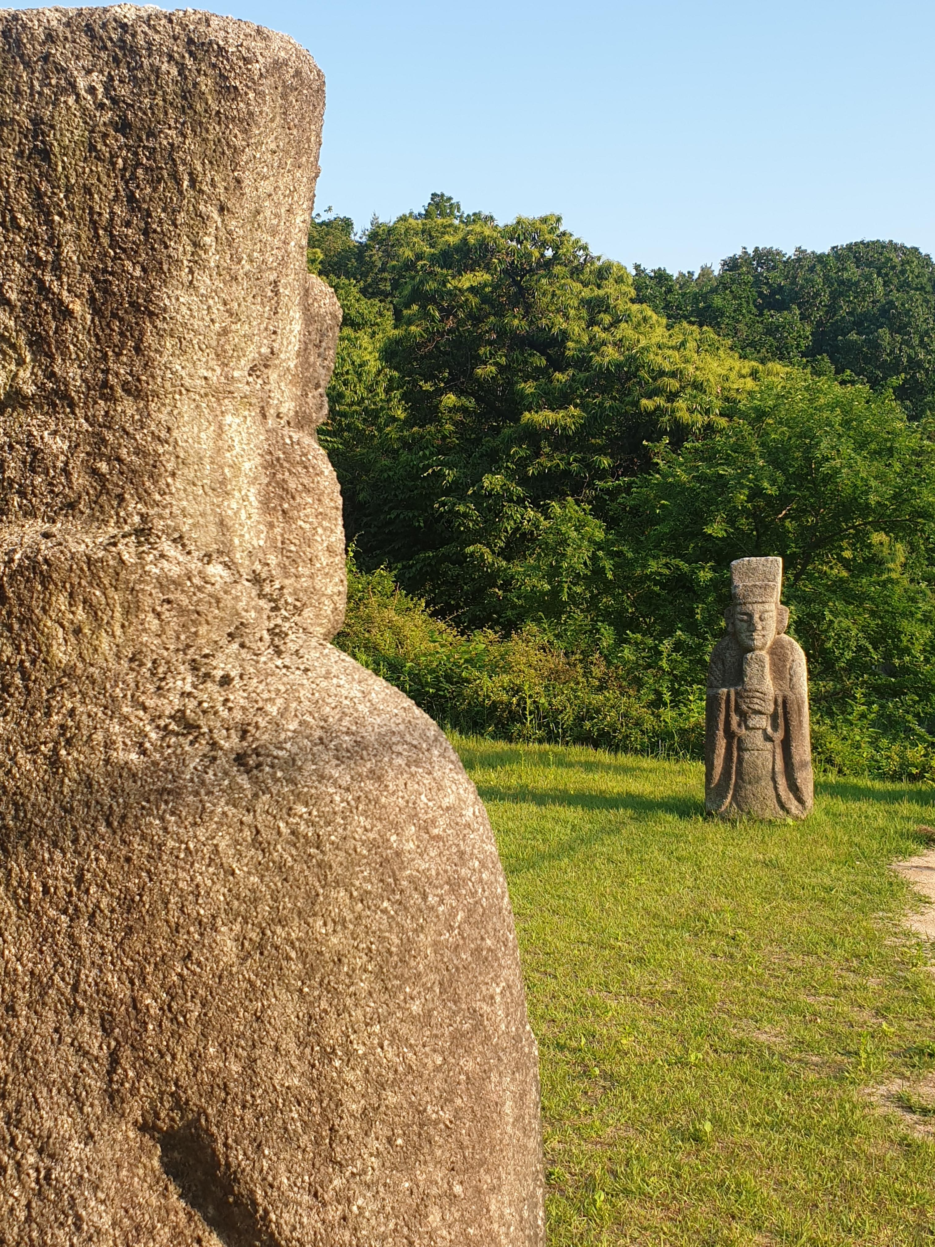 세트로 선 문인석 하나를 부여잡더니 기어이 기념사진 한 방 찍어달랜다.