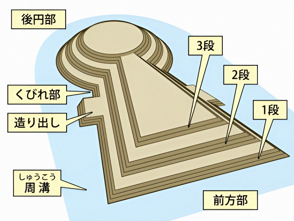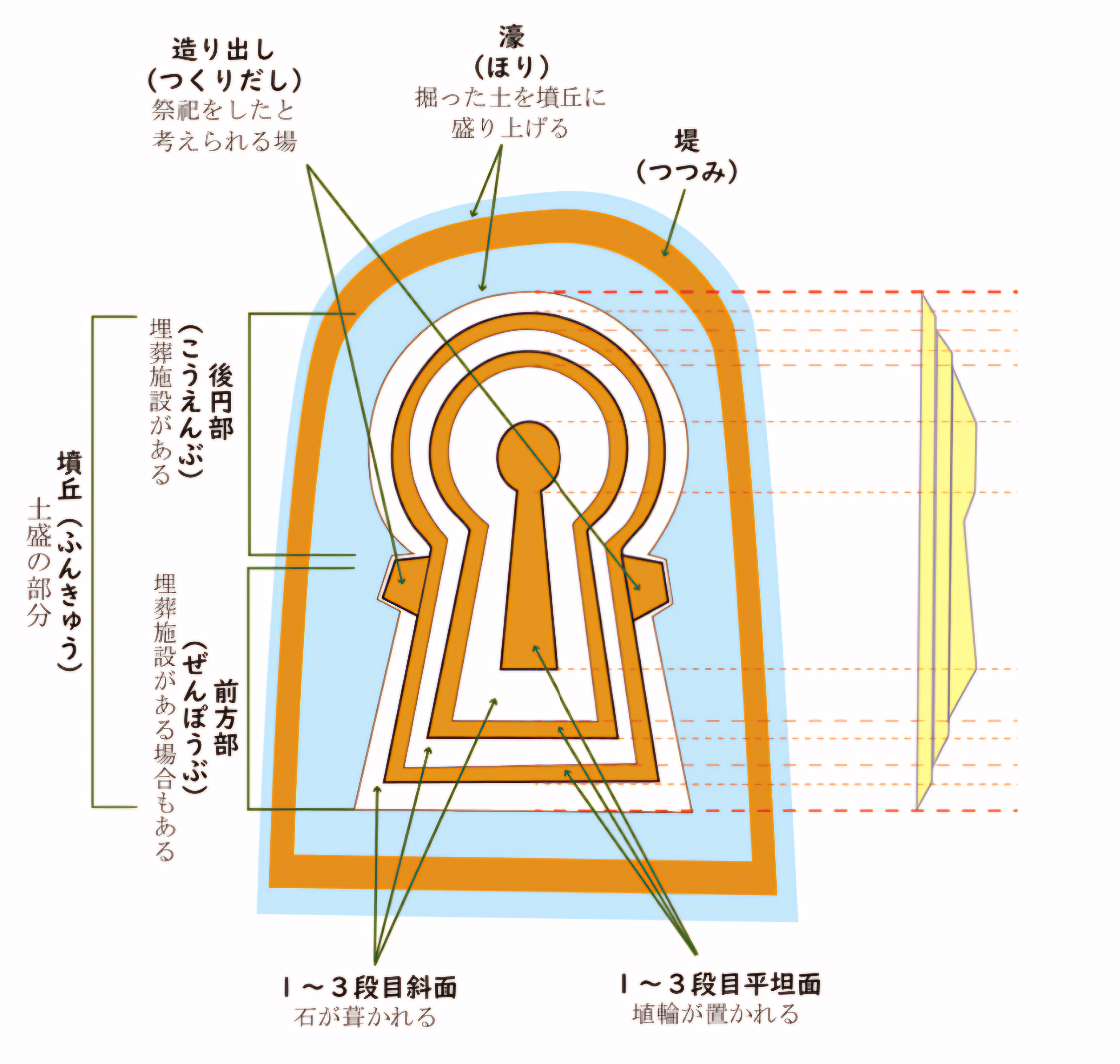 나아가 전방후원분에서는 또 쿠비레부くびれ部 라는 말도 자주 마주하거니와, 이건 따로 학술적 고고학적 개념이라기보다는 후원부와 전방부를 연결하는 지점 혹은 경계라 생각하면 되겠다. 허리춤이다.