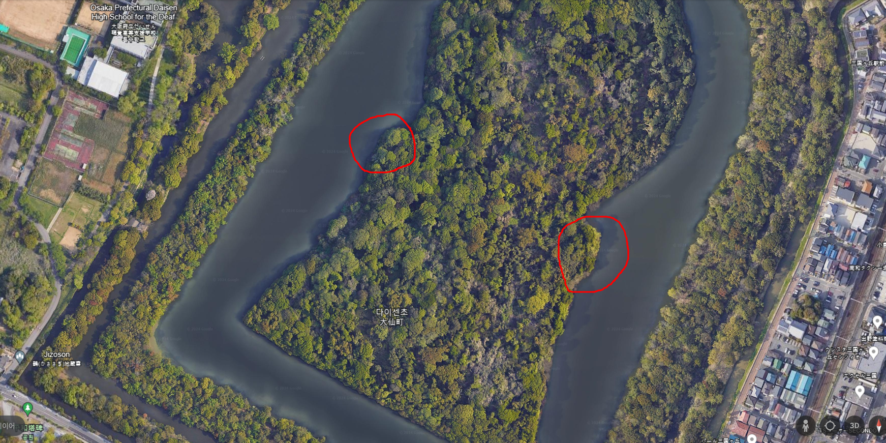앞 구글어스에서 보듯이 무덤 주인공을 묻는 직접 시설은 후반부 뒤쪽 북쪽에 둥근 봉분을 만들고, 그 앞쪽 남쪽에다가는 전방부前方部라 해서 마당처럼 두었다.