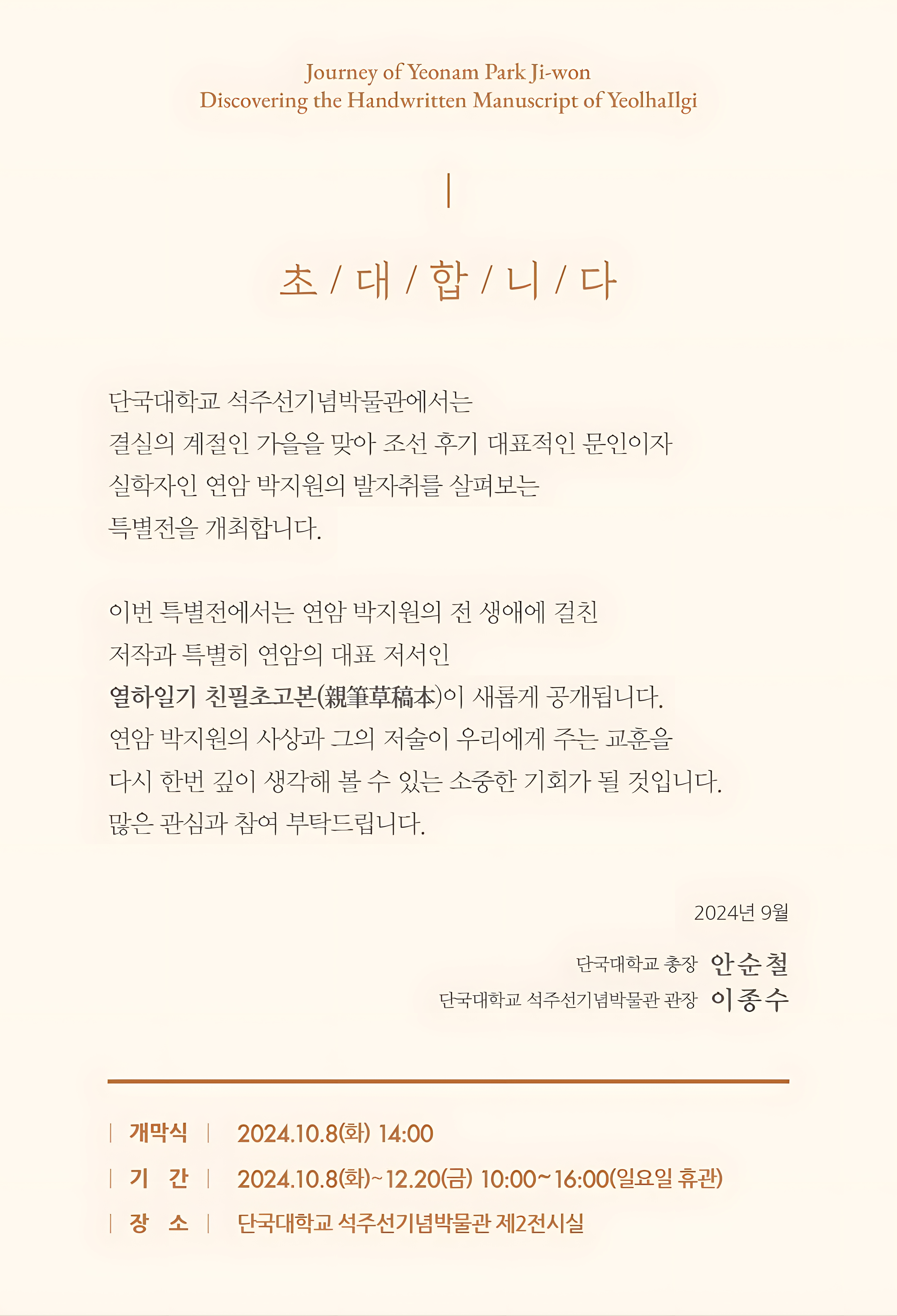 단국대 석주선기념박물관이 연암 박지원 열하일기 친필 초고본을 공개하는 행사를 한댄다.