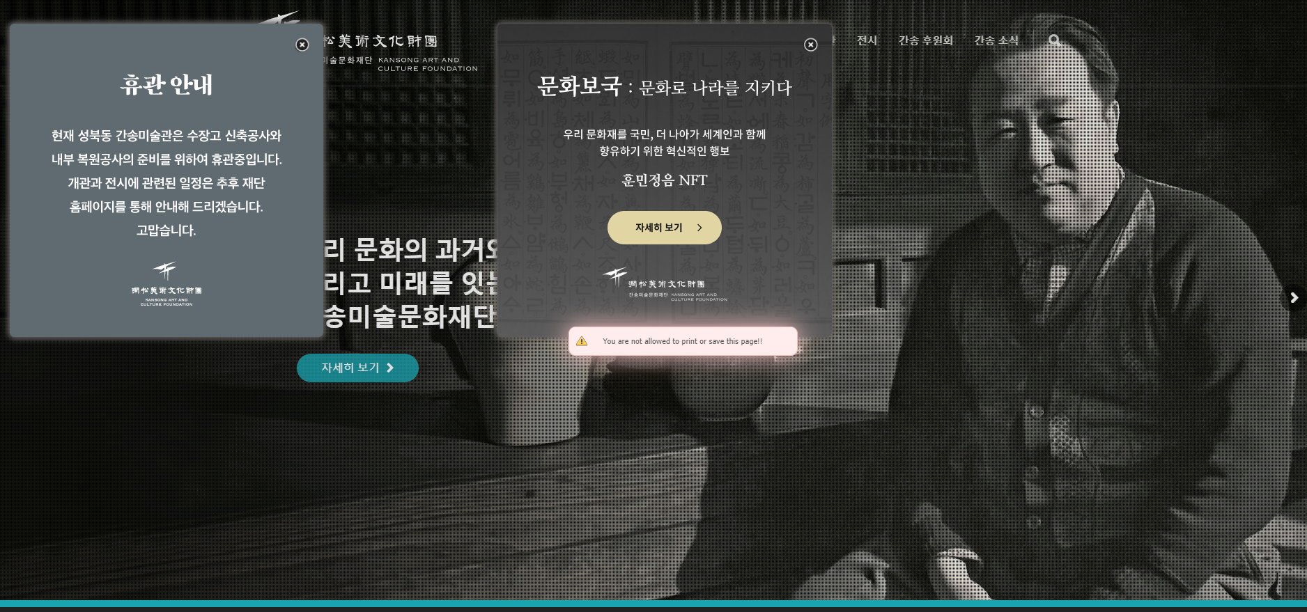 단군조선 건국 이래 가장 기묘한 상거래 모범을 보인 간송미술관 지금 이 시간 홈페이지 대문이다. 저에 보면 바라보는 이 기준 오른쪽에 중년 조금 툰실한 남성이 있으니 그가 바로 간송미술관 설립자로 간송이라는 호를 쓴 개성 상인 출신 거부 전형필全鎣弼(1906~1962)이다.