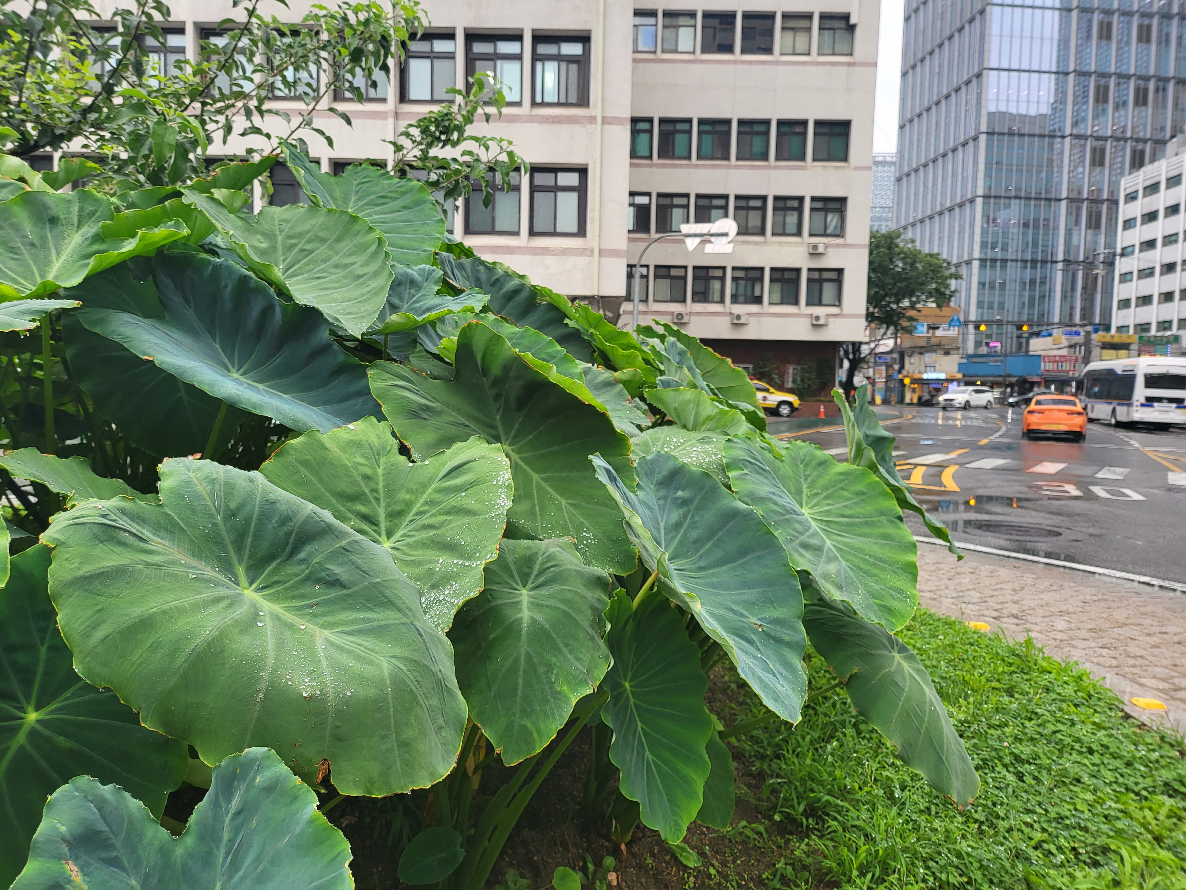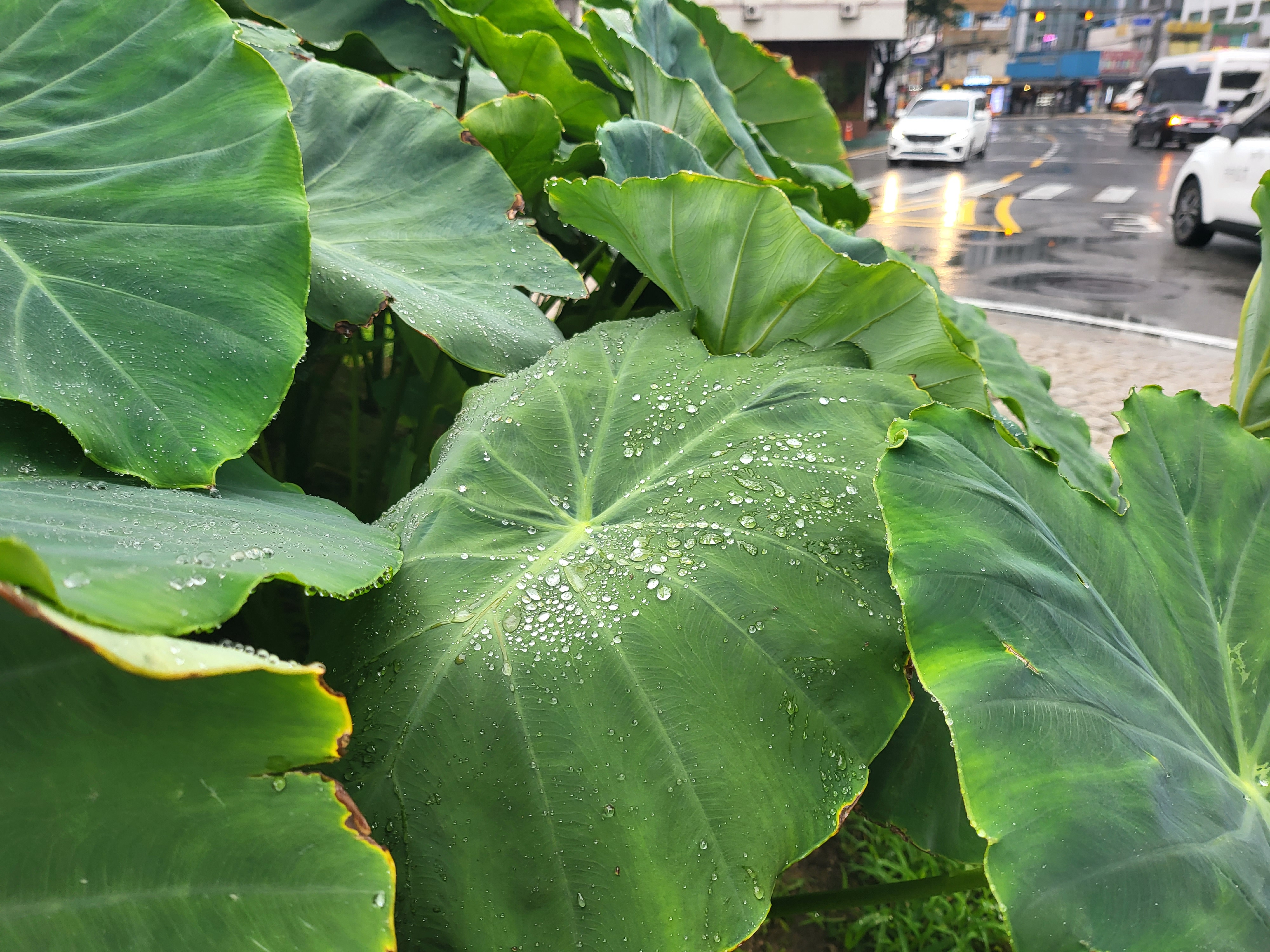 본래 저의 주무대는 농가 담벼락이나 텃밭 한자락이라 비가 올 때는 오동잎과 더불어 그 대용으로 쓰기도 했으니 우산으로서의 토란은 효율과는 거리가 멀어 그냥 폼새이기는 했다.