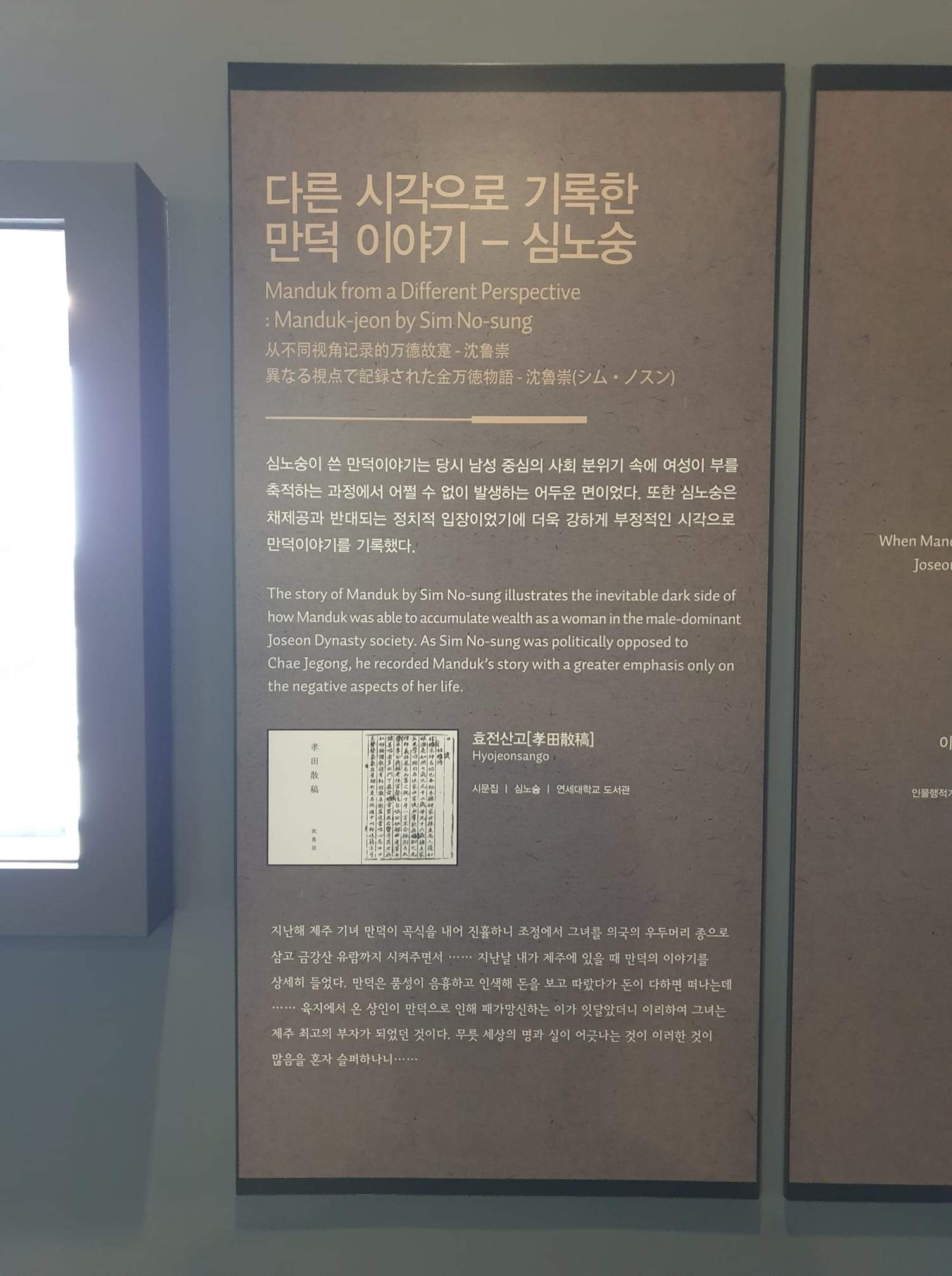 The story of Manduk by Sim No-sung illustrates the inevitable dark side of how Manduk was able to accumulate wealth as a woman in the male-dominant Joseon Dynasty society.