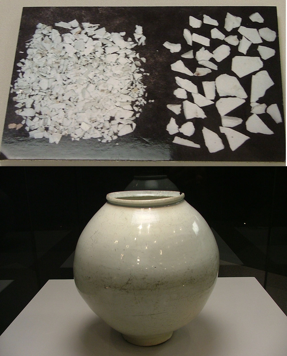 오사카동양도자미술관 소장품인 이 달항아리만큼은 여타와는 달리 전시공간 한 켠에 사진 두 장이 특별히 배치돼 있다. 그 사진 두 장에는 수백 점에 이르는 깨진 사기 조각들을 만날 수 있다. 이 사진은 무엇이고 또 이 달항아리는 무엇일까?