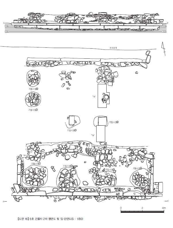 "5호 건물지의 기단은 총 9층으로 정지되어 있었다....기단 정지층은 풍화암반층 위로 암회갈색사질점토, 적갈색사질점토, 암회갈색사질점토, 암갈색사질점토 5개층, 암회갈색사질점토 순으로 조성되어 있었다. 그리고 정지층 내부에서 청동제기가 다량 출토되었다.
