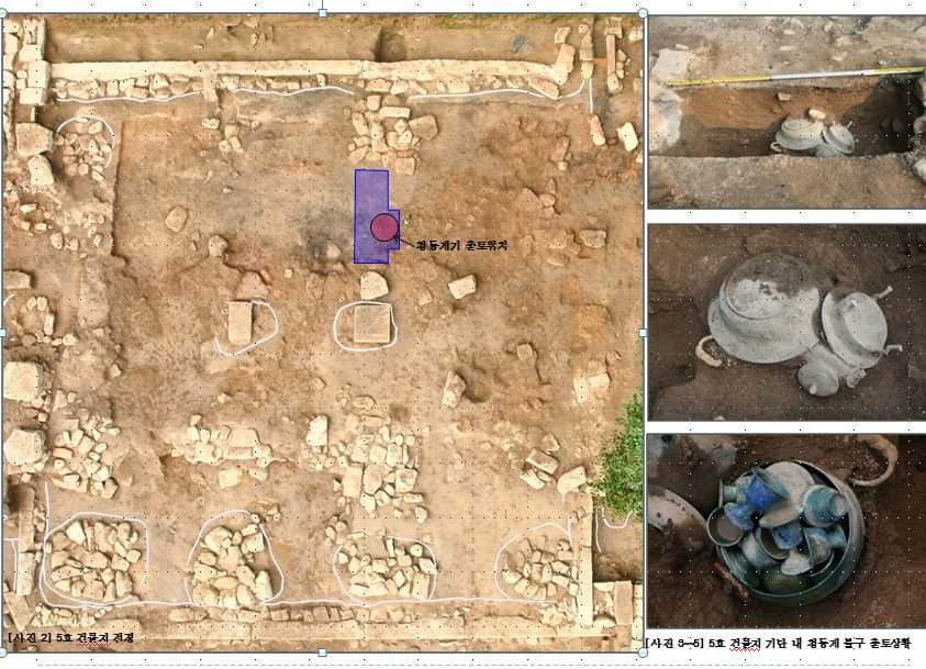 해당 유물이 출토된 위치의 정지층에 대한 단면조사와 기단 상면에 대한 평면조사에서 굴광선이 전혀 확인되지 않는 것으로 볼 때, 본 청동제기들은 5호 건물지 기단 정지층을 조성하면서 매납된 것으로 추정된다."