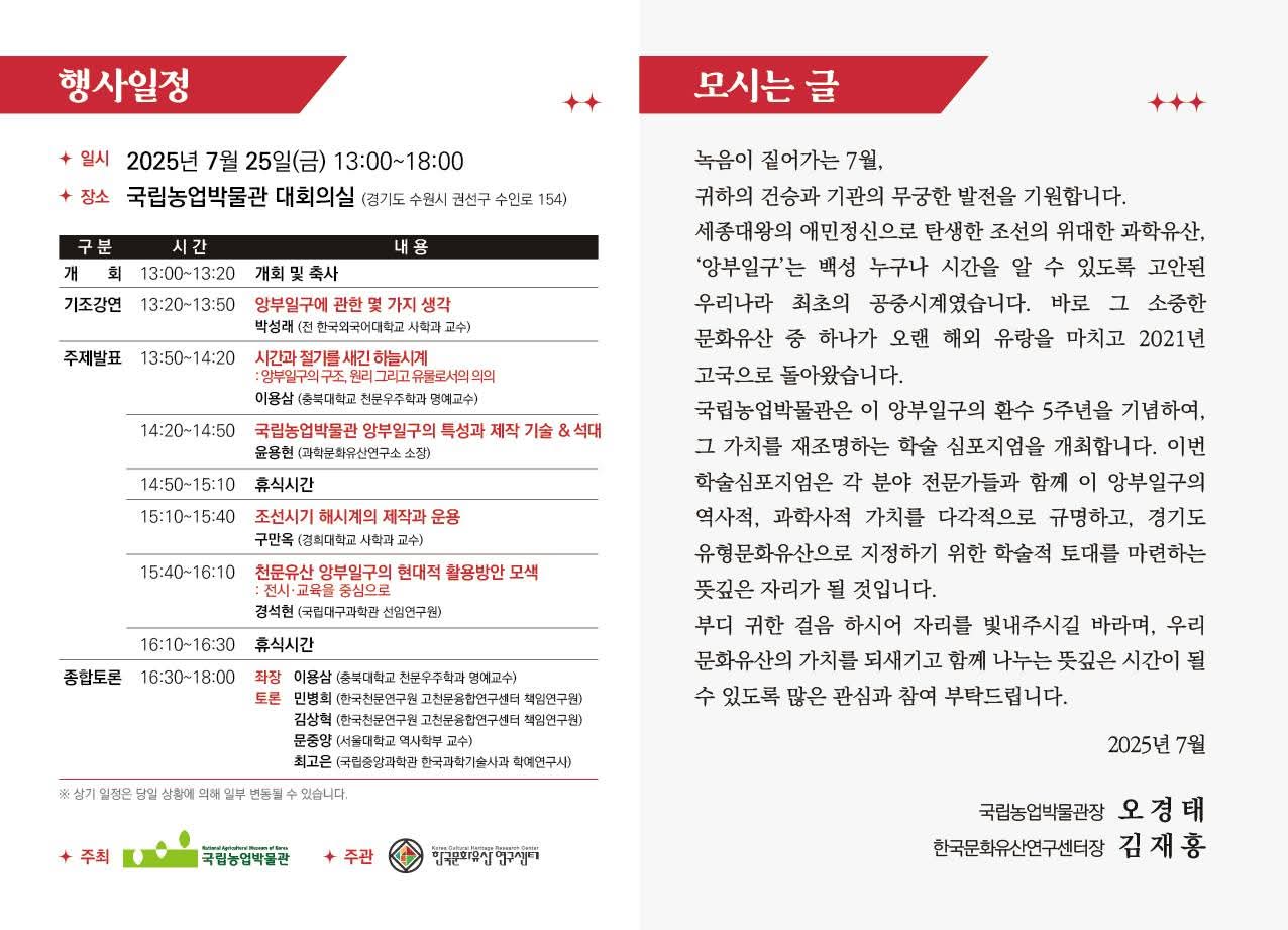 7월 25일(금) 국립농업박물관에서 앙부일구 환수 5주년을 기념하는 학술심포지엄을 개최합니다.