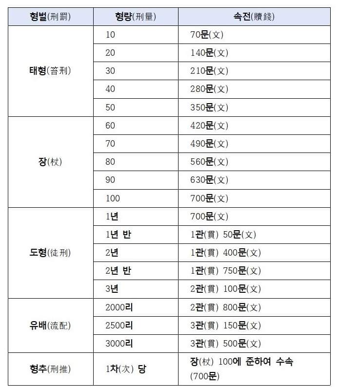 시대에 따라 저 금액이 조정되었는지는 확인하지 못하였으나, 조선후기 《고사신서攷事新書》 권2 〈태·장·도·류의 수속(笞杖徒流收贖)〉에 실린 것으로 보면 첨부한 그림과 같다.