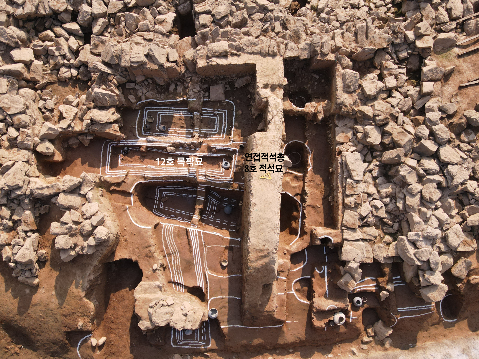 - 초대형 연접식 적석총 아래에서 무리 지어 발견된 널무덤의 다양한 모습 발견