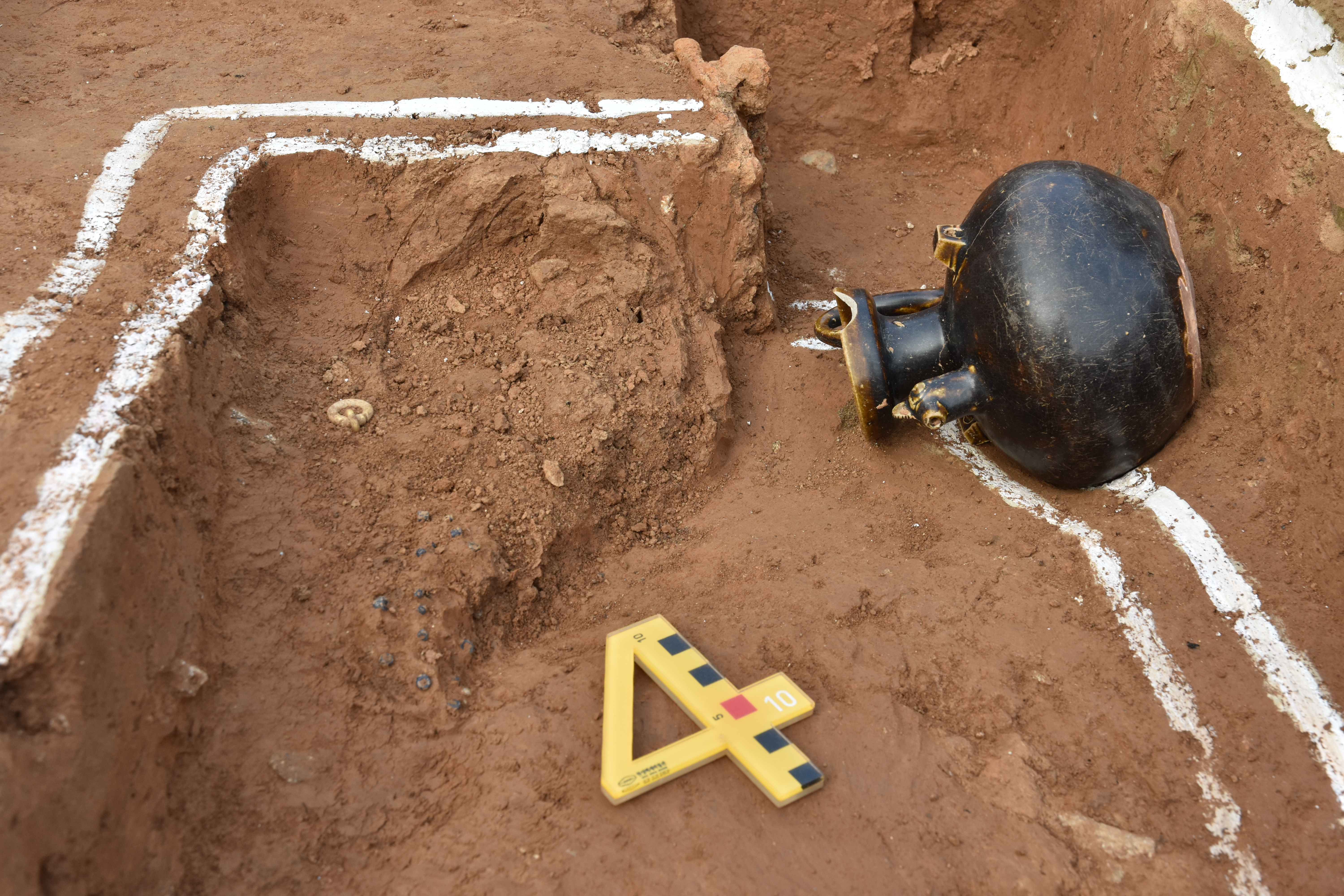 □ 8호 적석묘 아래에서 조사된 12호 널무덤의 주인은 금귀걸이와 유리구슬 목걸이로 치장했고 껴묻거리로는 중국제 흑유계수호(흑유 닭 모양 항아리), 백제 토기 항아리를 갖추고 있다. 특히 금귀걸이와 유리구슬 목걸이는 착장된 상태이며 흑유계수호는 제 위치에서 온전한 상태로 확인되었다. 이는 백제 지배층의 장례문화와 묘제를 파악할 수 있는 귀중한 자료로 판단된다.