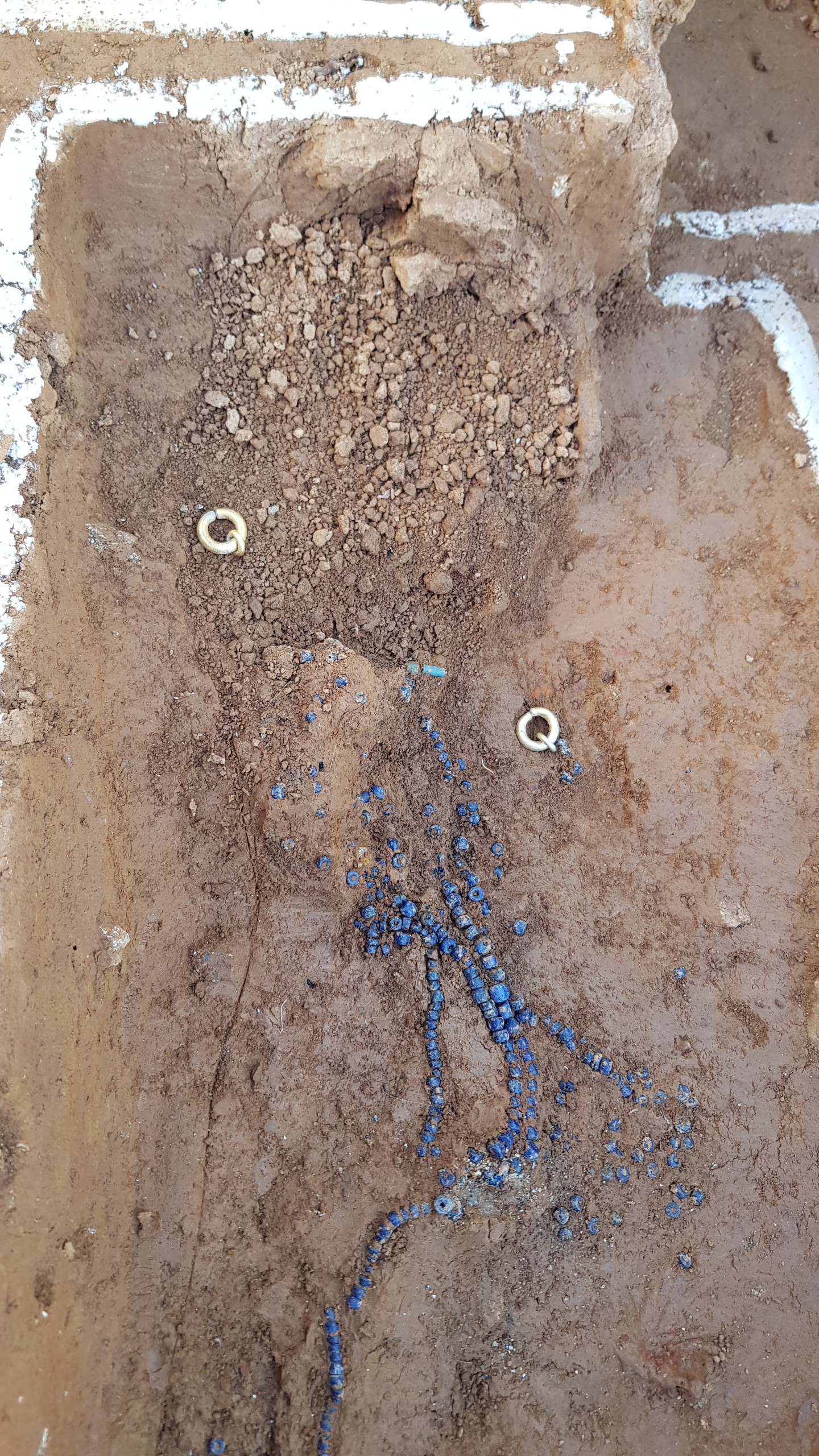 □ 8호 적석묘 아래에서 조사된 12호 널무덤의 주인은 금귀걸이와 유리구슬 목걸이로 치장했고 껴묻거리로는 중국제 흑유계수호(흑유 닭 모양 항아리), 백제 토기 항아리를 갖추고 있다. 특히 금귀걸이와 유리구슬 목걸이는 착장된 상태이며 흑유계수호는 제 위치에서 온전한 상태로 확인되었다. 이는 백제 지배층의 장례문화와 묘제를 파악할 수 있는 귀중한 자료로 판단된다.