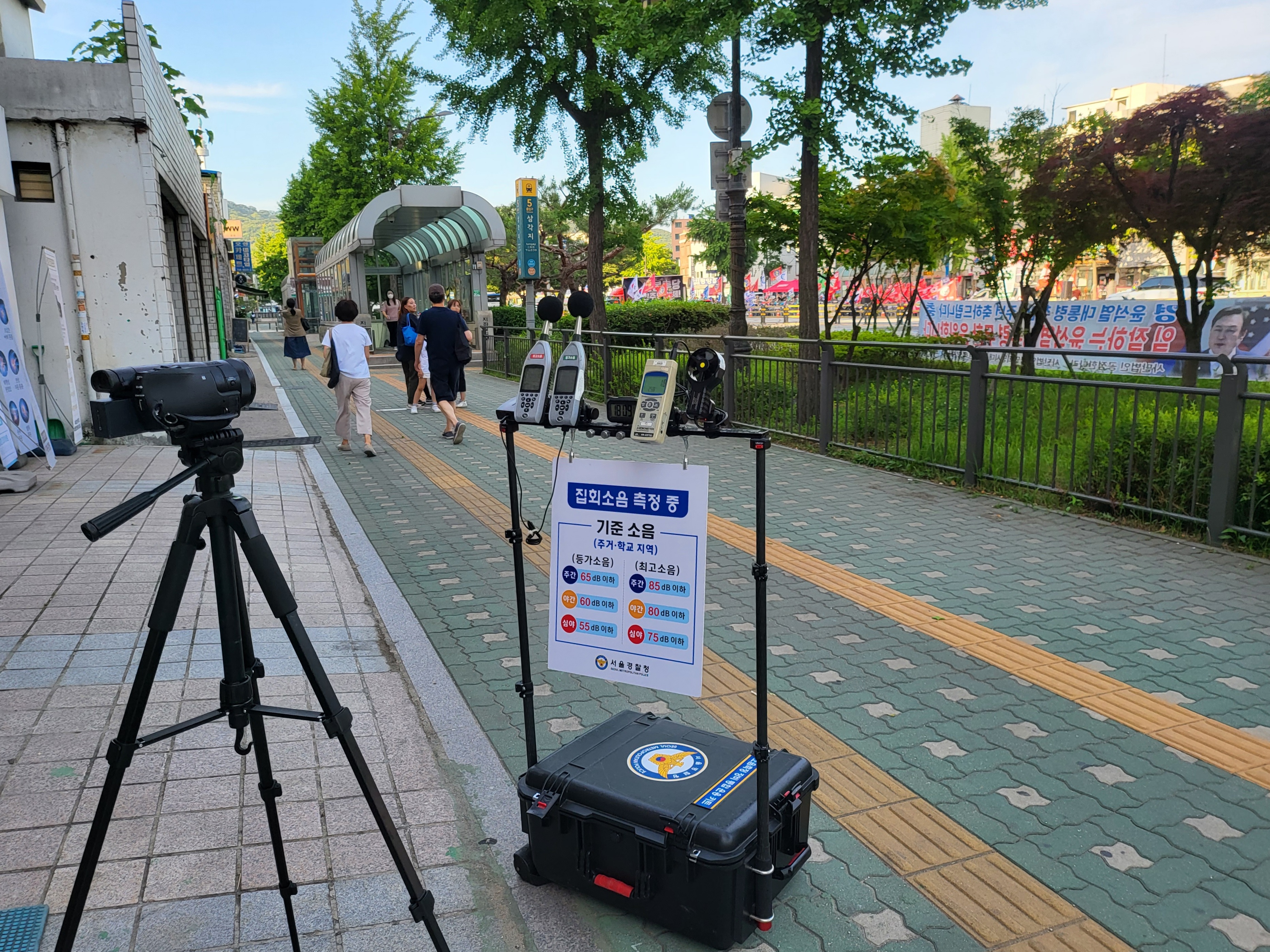 삼각지 시위현장 한 켠을 보니 그 시위장 맞은편 인도에서 경찰 쪽에서 확성기 소음을 측정 중이다.