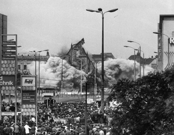 1968년 5월 30일, 이 교회는 당시 독일사회통합당 the Socialist Unity Party of Germany (SED) 결정에 따라 폭파되어 사라지는데, 세계대전 피습에서도 살아남은 교회가 한순간에 잿더미로 변한 것이다. 반체제 성향을 보이는 사람들이 모이는 곳이라 해서 그랬다는데, 문명에 대한 폭거였다.