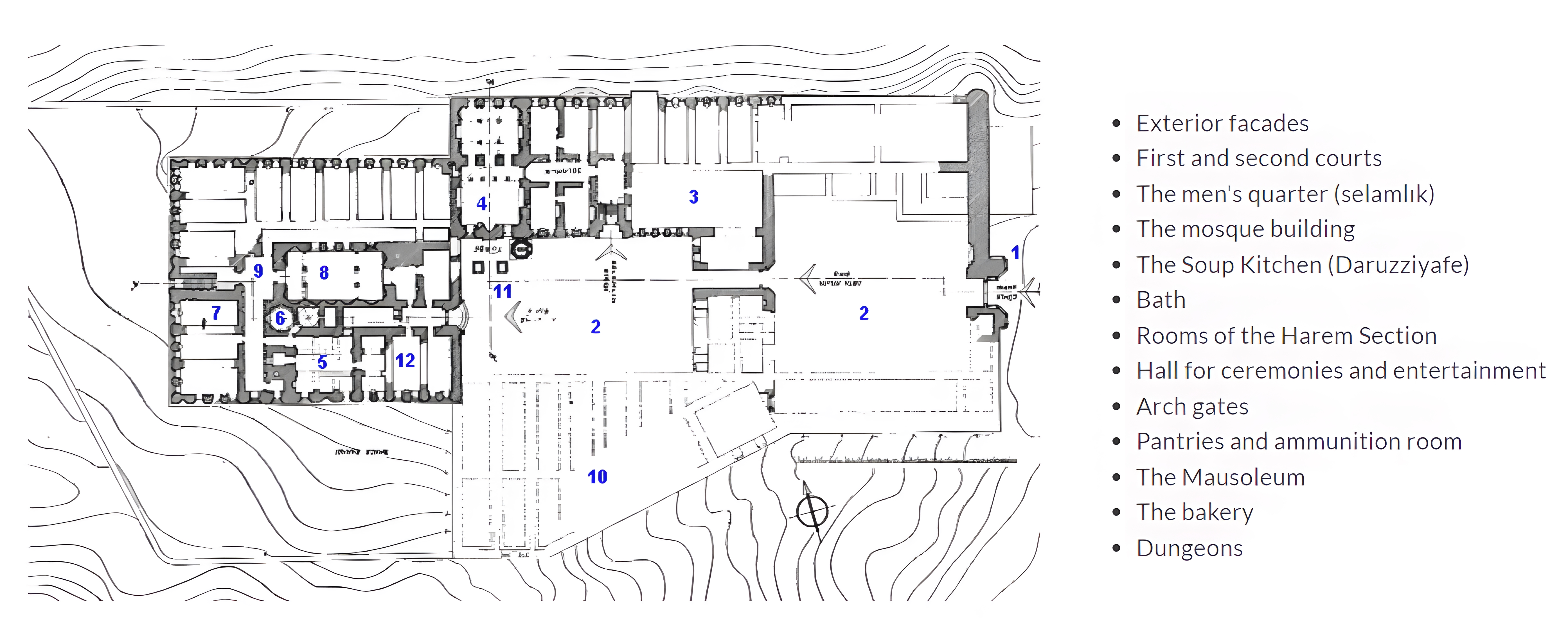 문에 적힌 비문에 따르면 궁전 하렘 Harem 부분은 1784년 Ishak (Isaac) Pasha가 완성했다.
