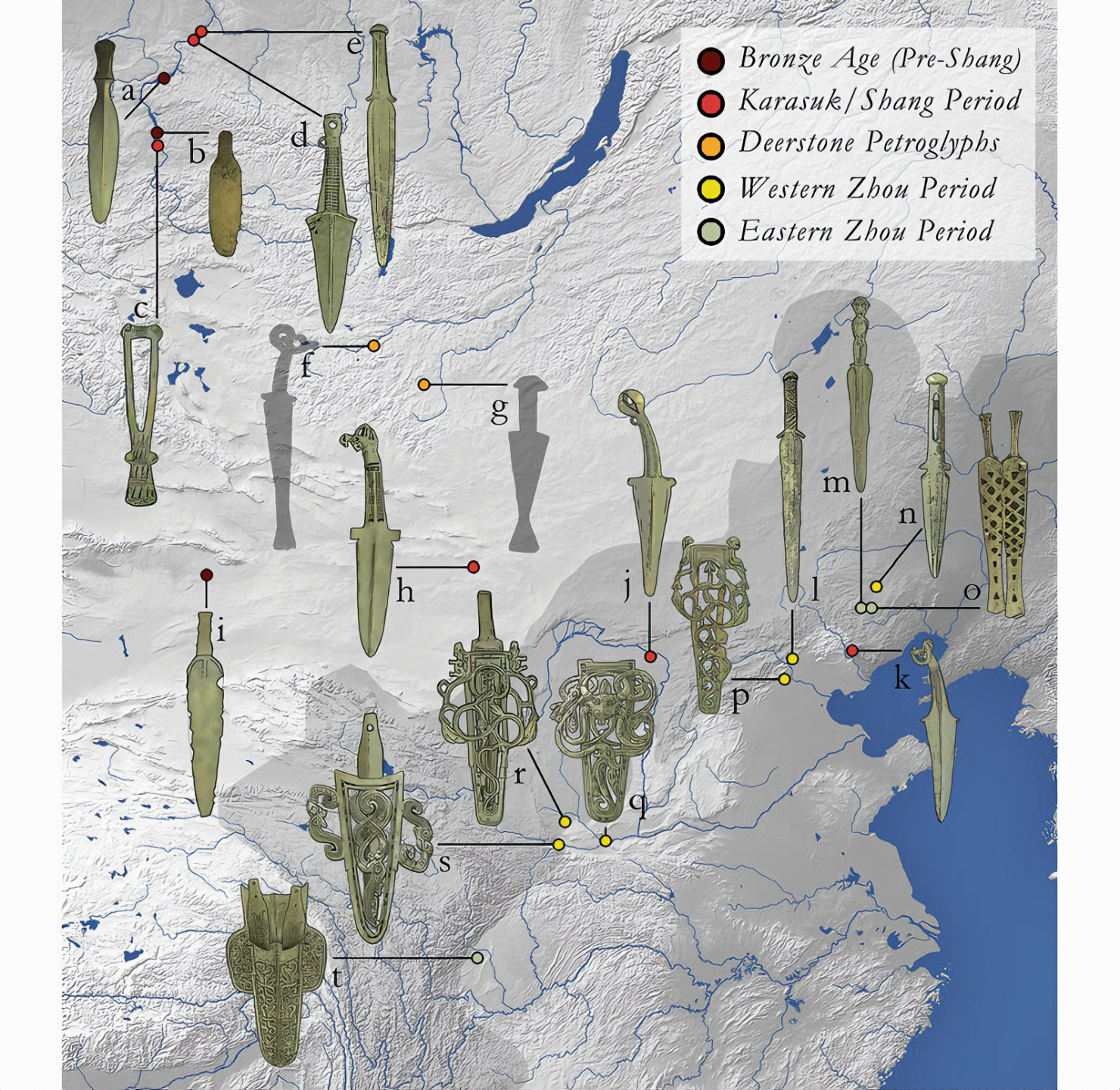 Map of the eastern steppe and the arc showing the distribution of small swords or daggers along the arc. Minusinsk Basin (a-e): a) Krivosheino (Andronovo); b) Potroshilovo (Okunevo); c) Krasnopol'e; d) Kaptyrevo; e) Chasto-ostrovsoke; Mongolia (f-h): f ) Galt, Khovshol Province; g) Battsengel, Arkhangay Province; h) chance find, Ömnögovi Province; China (i-t): i) Tianshanbeilu, Xinjiang; j) Xuhaishuwan; k) Chaodaogou; l) Baifu; m) Nanshangen; n) Shaoguoyingzi; o) Ningcheng City; p) Liulihe; q) Xi'an; r) Baicaopo; s) Baoji Zhuyuanguo; t) Chengdu. Map and drawings by Peter Hommel.