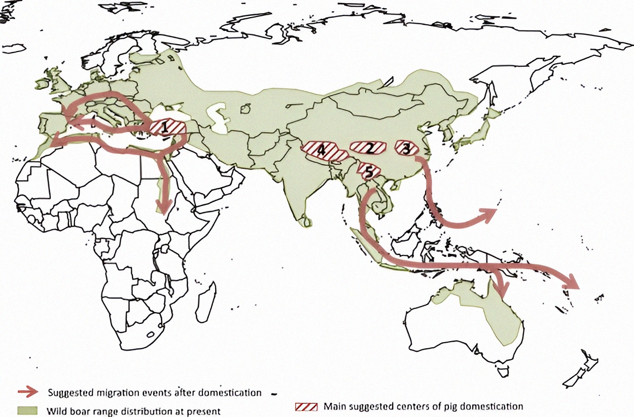 돼지는 현재 메소포타미아와 중국 두 군데에서 독립적으로 사육이 시작되었다고 본다.