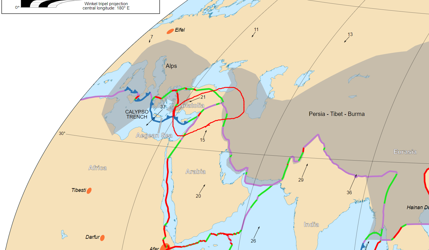 좀 더 광범위한 국면에서 저 지점을 중심으로 본 판구조 지도는 저렇단다. 터키가 동부에서 시리아 이란 등과 국경을 인접하는 지점이 두 판이 충돌하는 구간임을 본다.