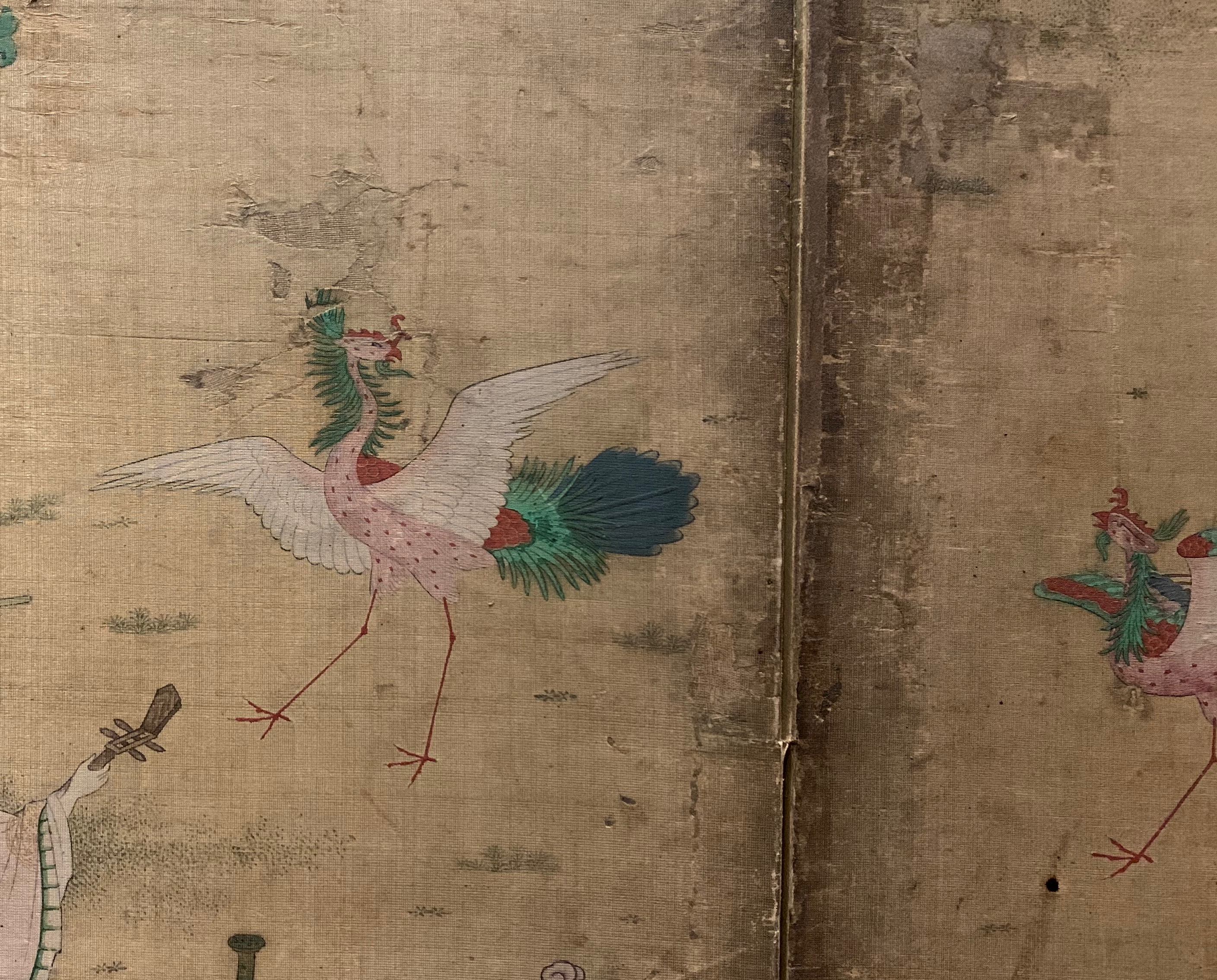 불로장생(不老長生)의 의미가 있는 학, 사슴과 같이 춤을 추고 있는 여인. 여인이 들고 있는 부채가 재밌는데, 새의 흰 깃으로 만든 백우선(白羽扇) 같은데, 설마 옆에 흰 학....