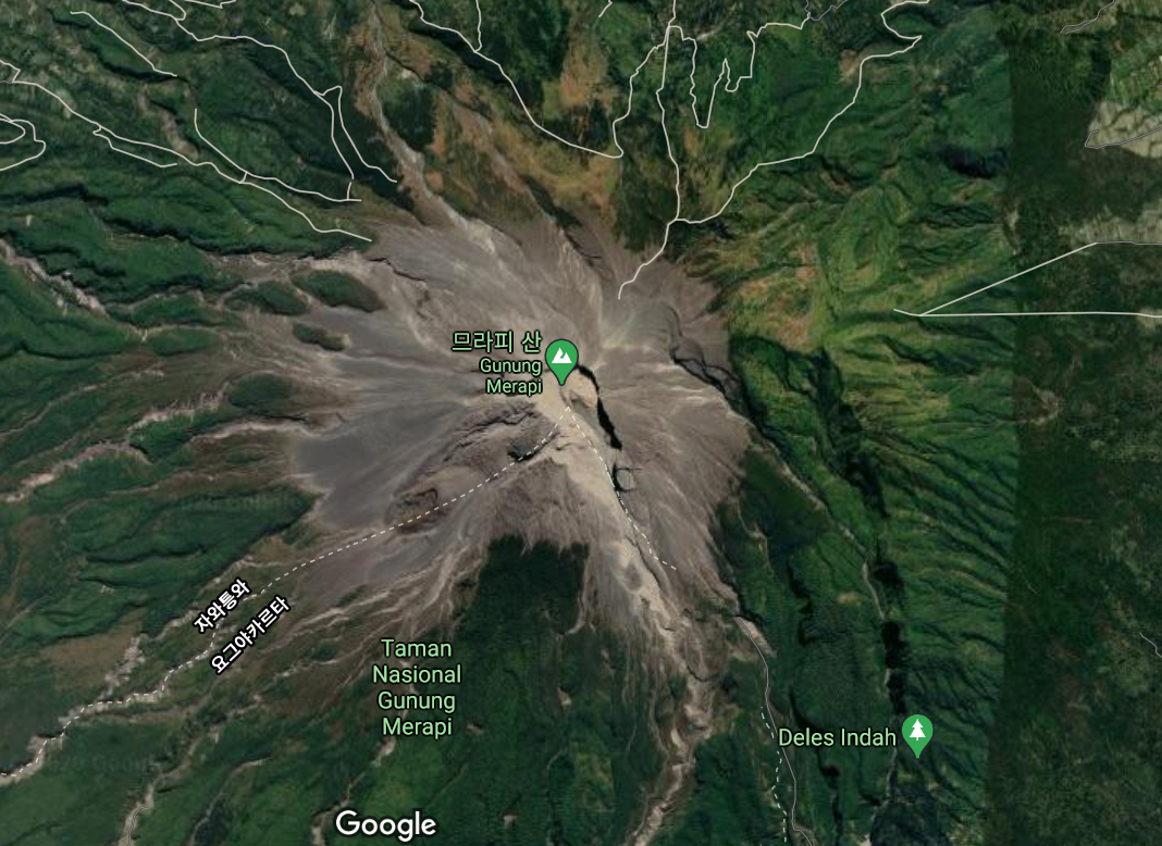 인도네시아어 혹은 자바어로는 구눙 므랏삐 Gunung Merapi 라 하는 모양이라, 현재도 왕성히 활동하는 활화산 active stratovolcano 혹은 active volcano 대표주자다. 중부자바 Central Java 와 족자카르타 특별주 Special Region of Yogyakarta 경계지점에 우뚝선 이 화산은 기록상으로 보면 1548년 이래 발작적 폭발을 일으켰다.