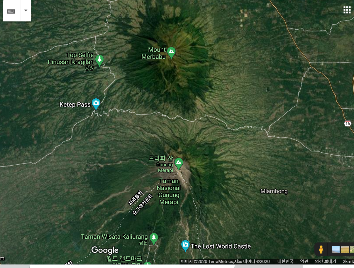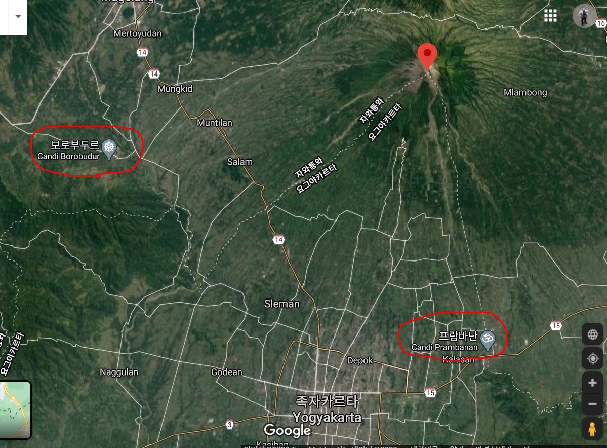 므라피 폭발은 주변에 포진하는 혁혁한 문화유산에도 적지 않은 피해를 내곤 하거니와, 바로 앞 구글 위성지도에서 확인하듯 정남쪽과 정서쪽 비슷한 거리에 각각 찬디 프람바난 Candi Pramban 과 찬디 보로부두르 Candi Borobudur 가 위치한다.