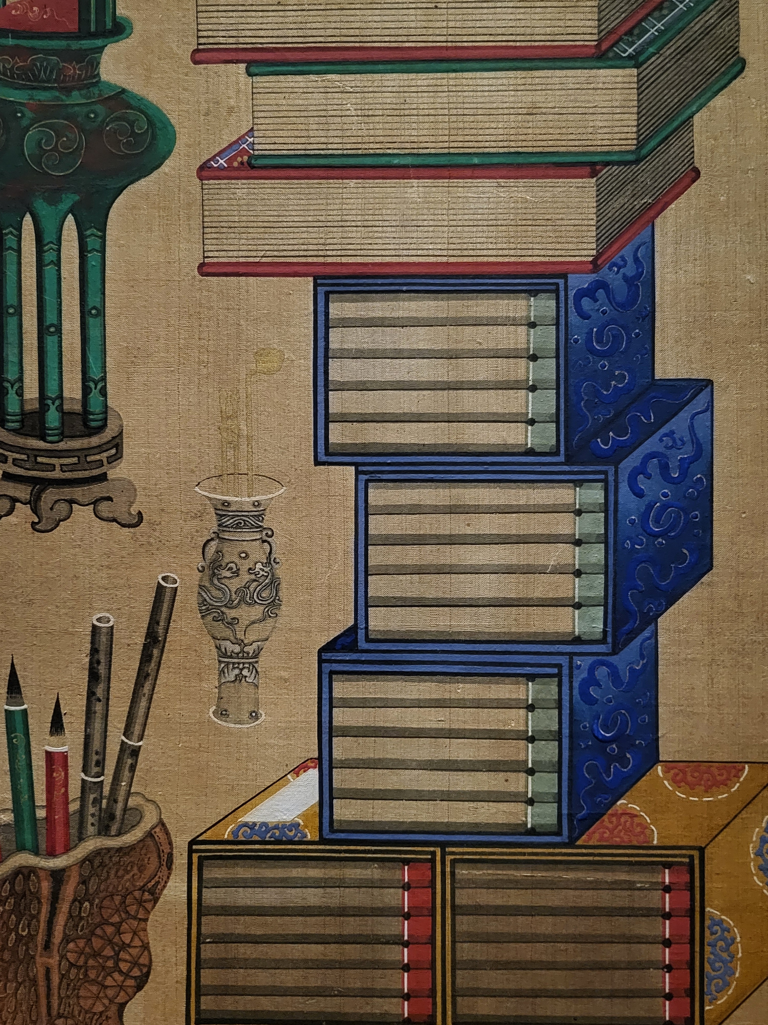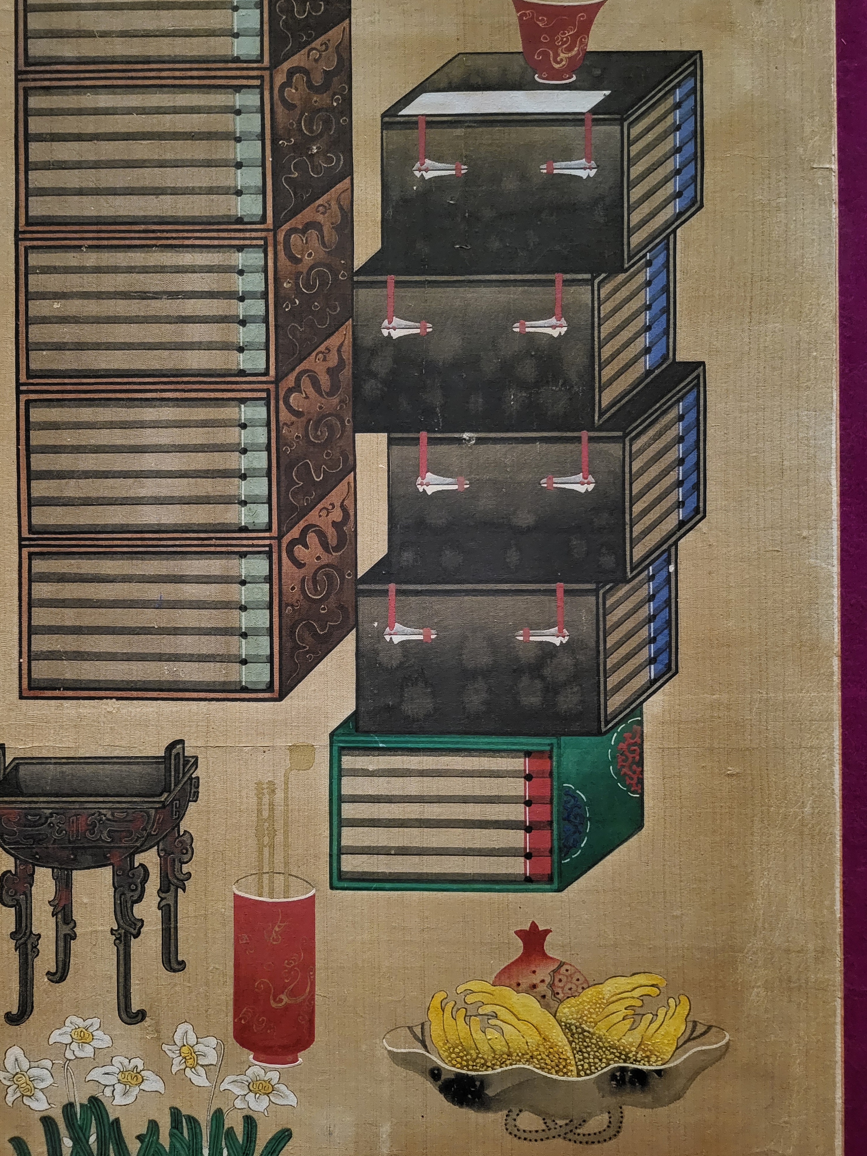 책과 문방구류는 학문과 배음에 대한 열망, 그리고 좋은 문방구를 수집하고 감상하는 취향을 나타낸다. 불수감, 수선화 등은 부귀와 다산의 소망을 담은 것이다.