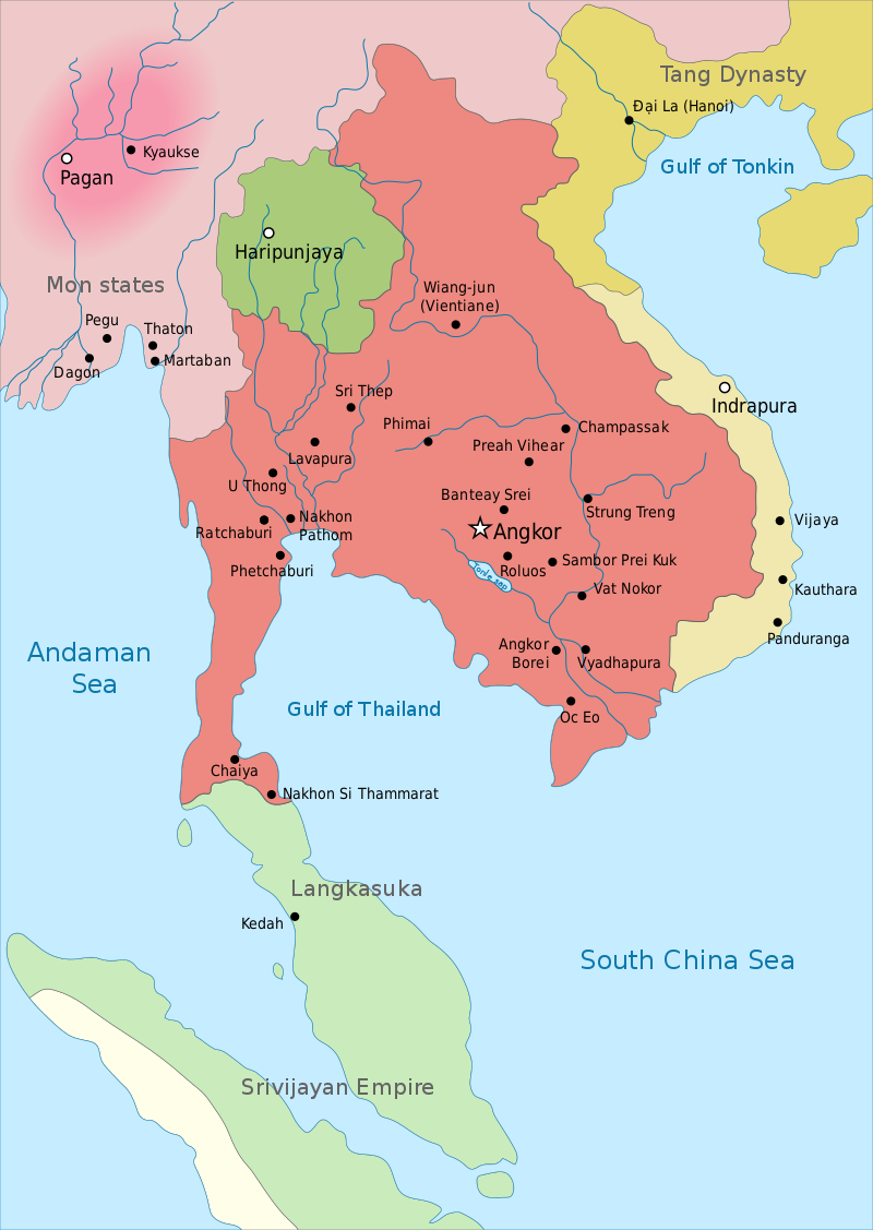 크메르 제국 영토 확장 과정은 앞에 제시한 지도 석 장을 참고하면 되겠고 그 안에서 그 수도 앙코르와 왓푸 위치를 보자.