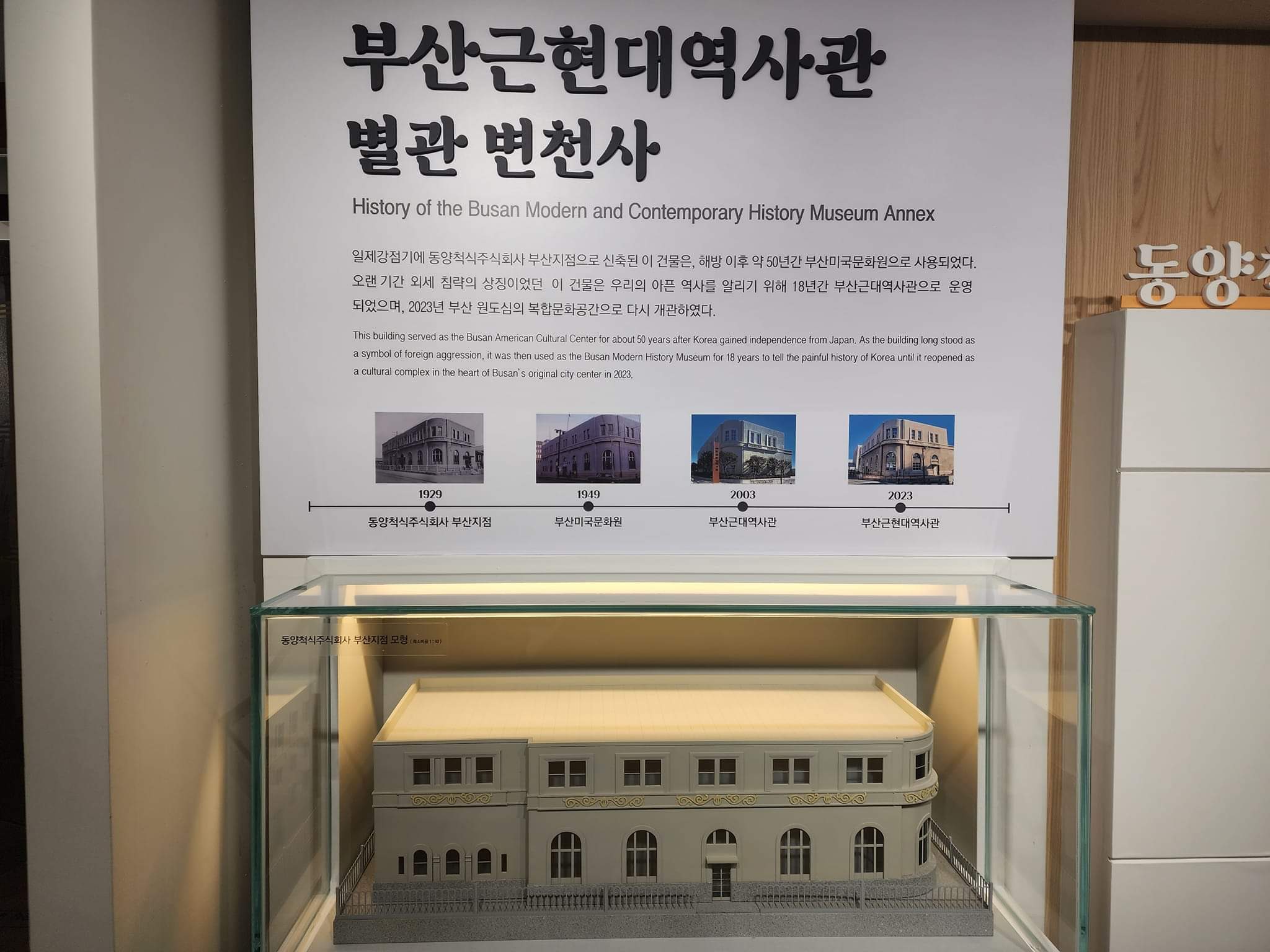 동척 부산지점-미문화원-부산근대역사관 건물이 별관이 되고, 바로 옆 조선은행 부산지점-한국은행 부산지점 내력을 가진 건물이 본관이 되어 "부산근현대역사관"으로 재개관 했다.