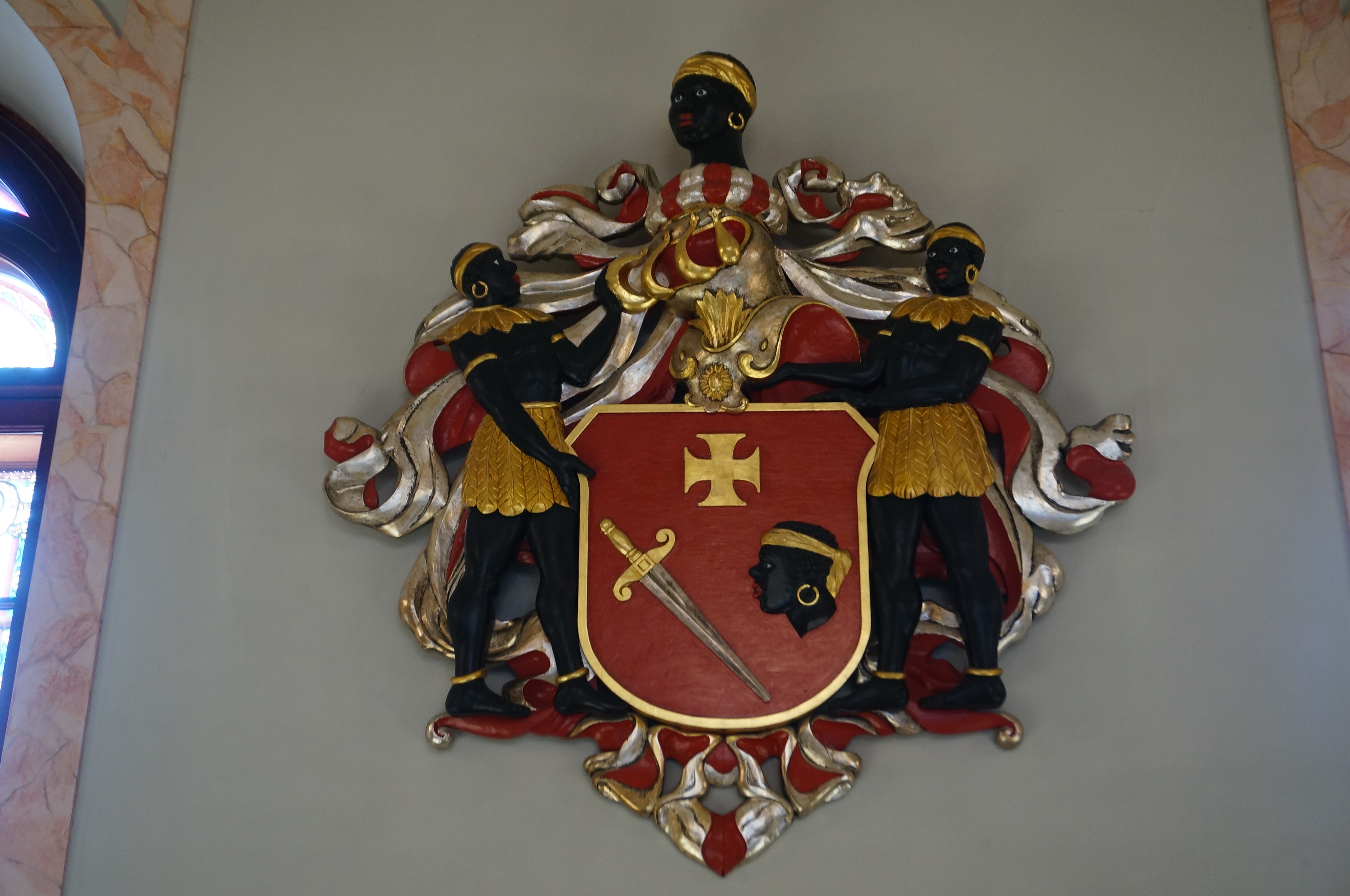3세기경의 이집트인이었던 Saint Maurice는 중세에 와서 갑자기 흑인으로 묘사되기 시작했고(이유에 대해서는 여러 설이 있다) 이 건물과 검은 머리 형제단 문장에는 중세시기의 묘사대로 표현된 것 뿐.