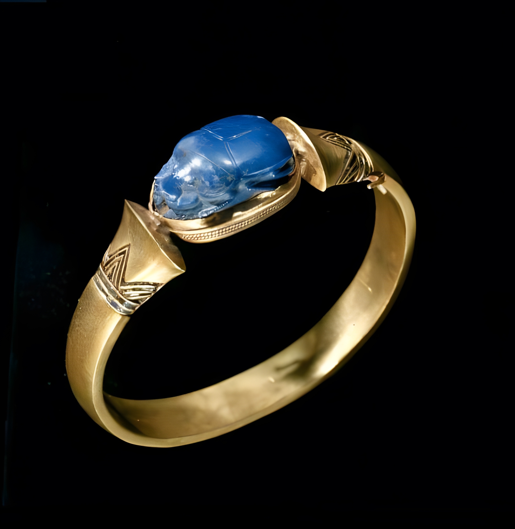 사진은 그의 팔찌 bracelet 다. 금으로 제작했고 라피스 라줄리 lapis lazuli 로 만든 스카라브, 장수풍댕이scarab를 장착했다.