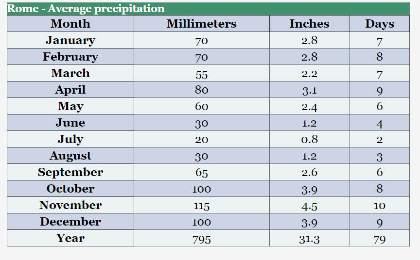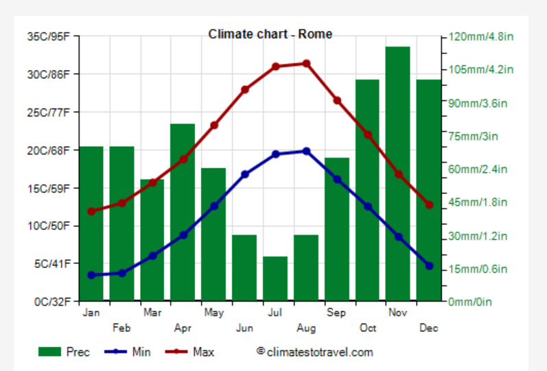 이건 연평균 월별 로마 기온이랑 강수량이다. 내 경험이 틀린 것은 아님을 본다.