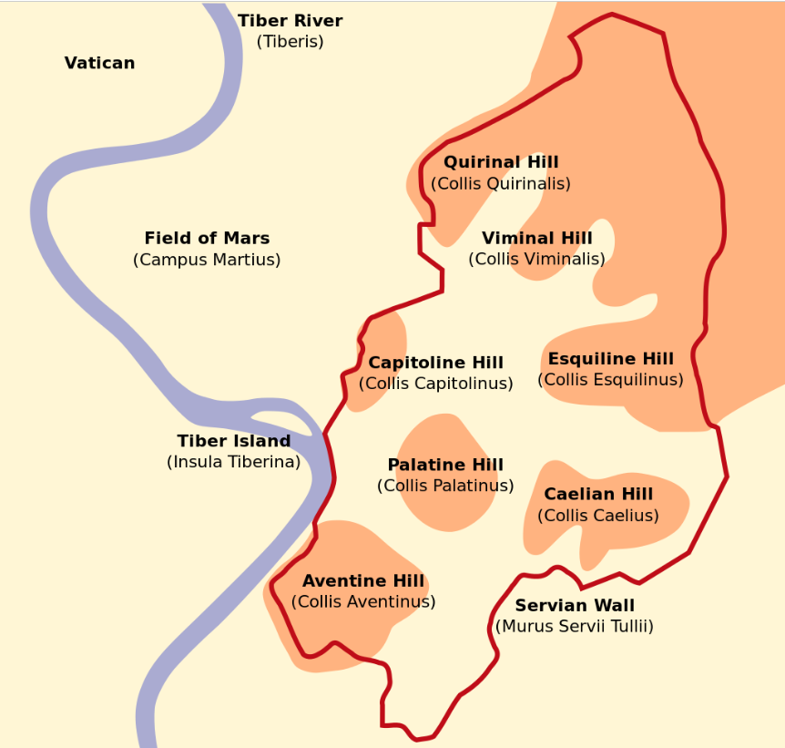 로마는 전체로 보아 분지라고도 할 만하겠지만, 실상 비교적 높은 산이 너무 먼 데 펼쳐진 평야도시다. 그 복판을 테베르 강이 흘러가며 젖줄 구실을 하지만, 우리가 생각하는 그런 충적지대랑은 거리가 좀 있다.